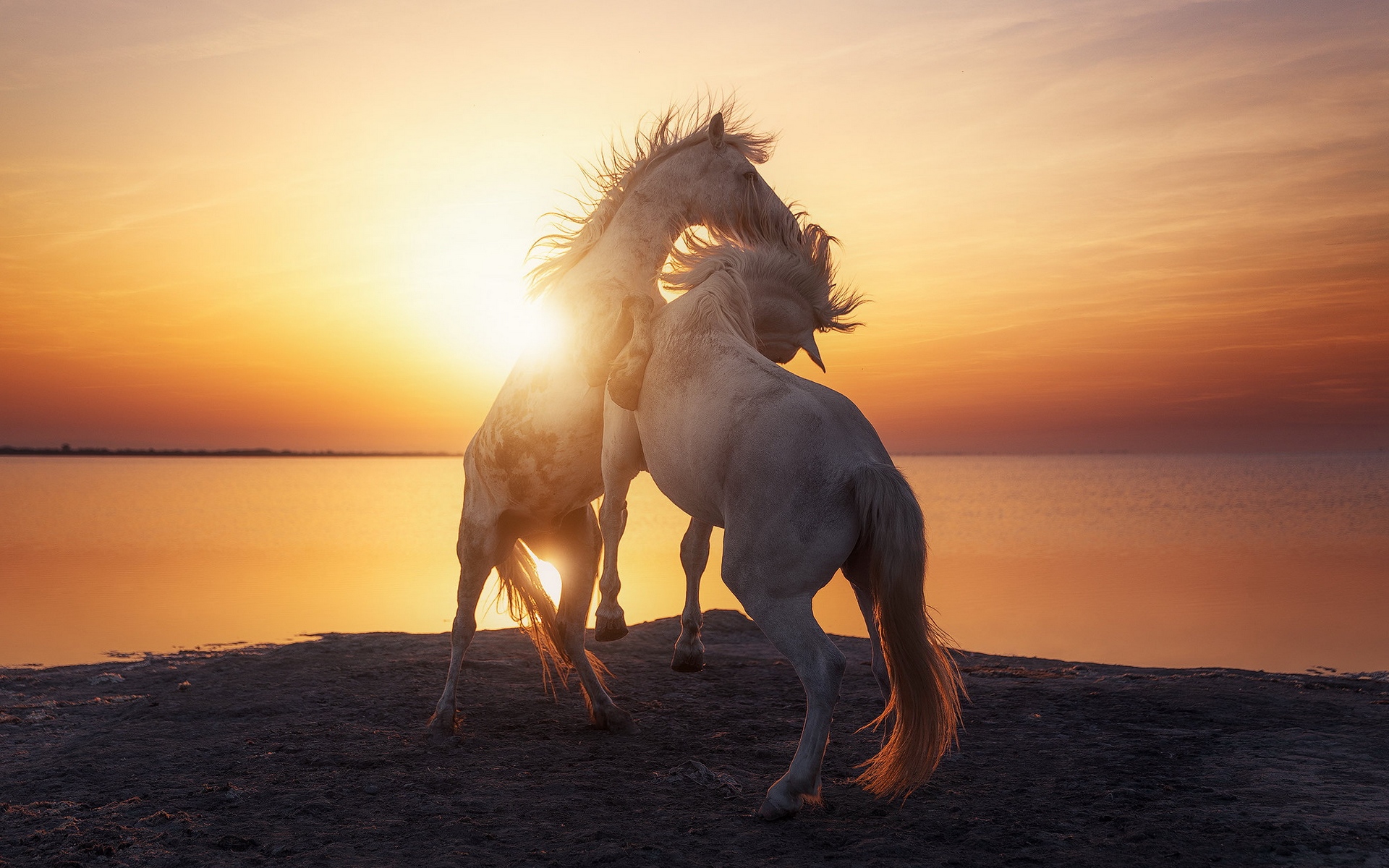 Description: Two horses are standing on a beach at sunset or sunrise time.