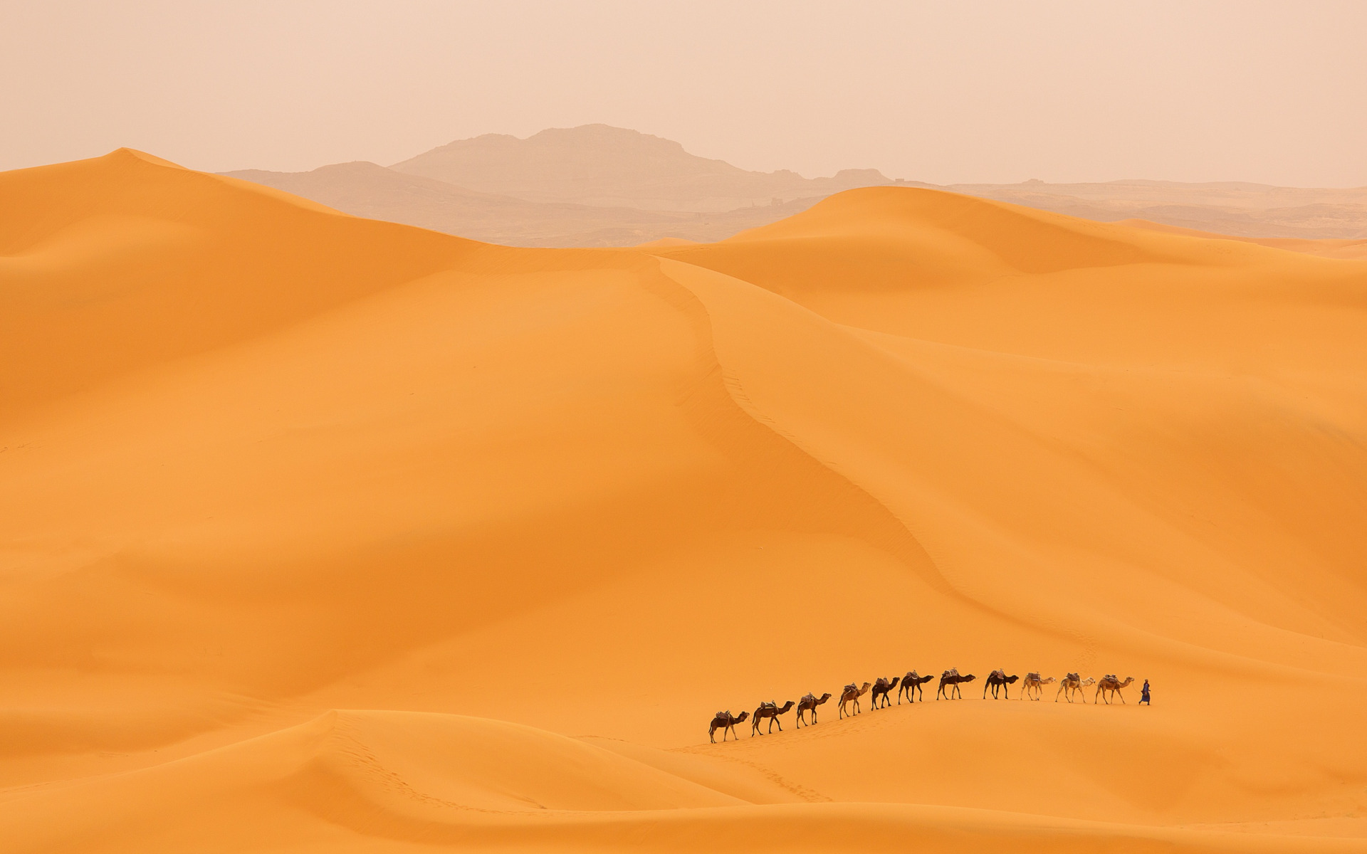 Description: A group of horses walking across a desert landscape with mountains in the background and a sky line in the foreground.