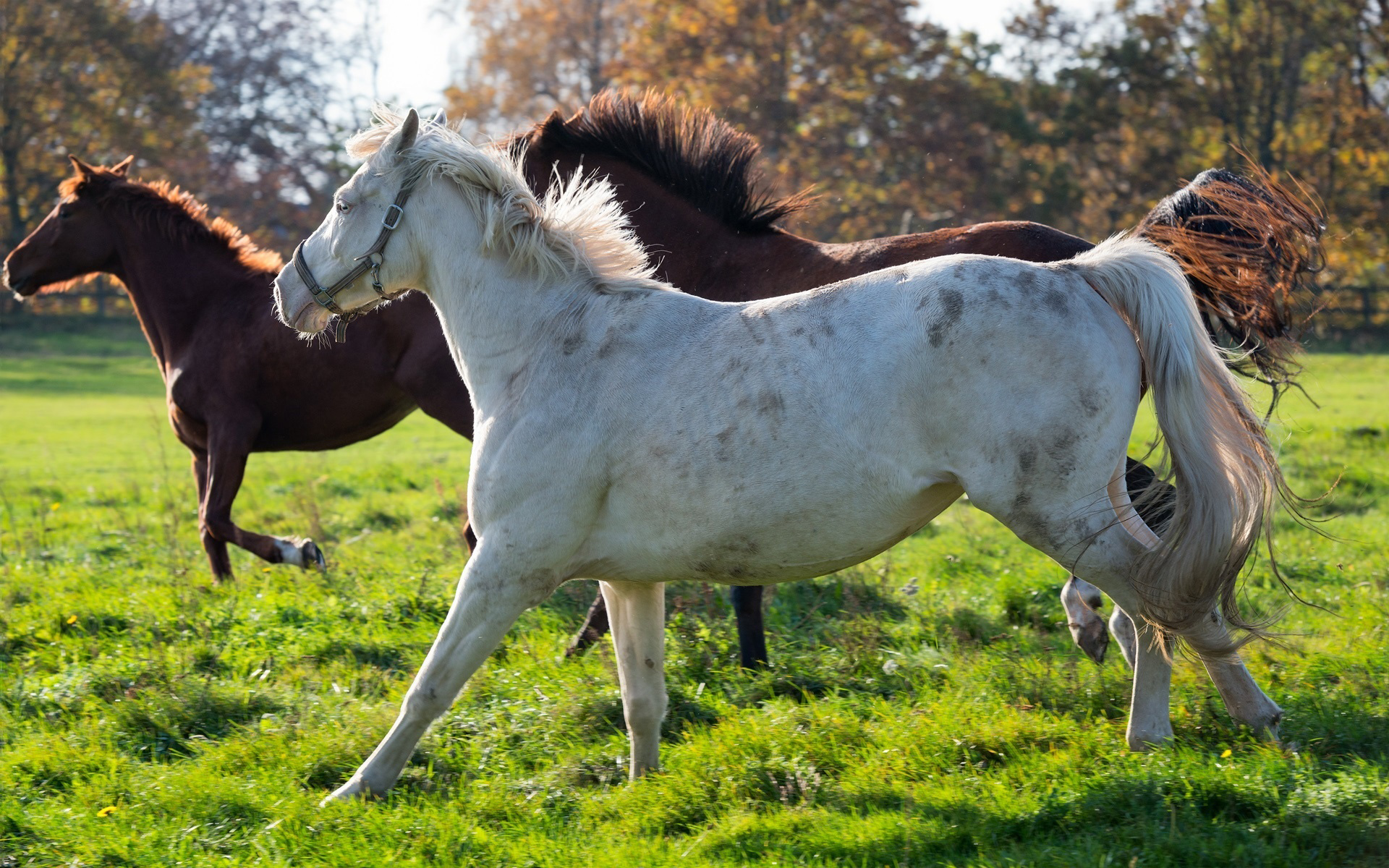 Description: Three horses running in a field of grass with trees in the background and one horse is running away from the camera.