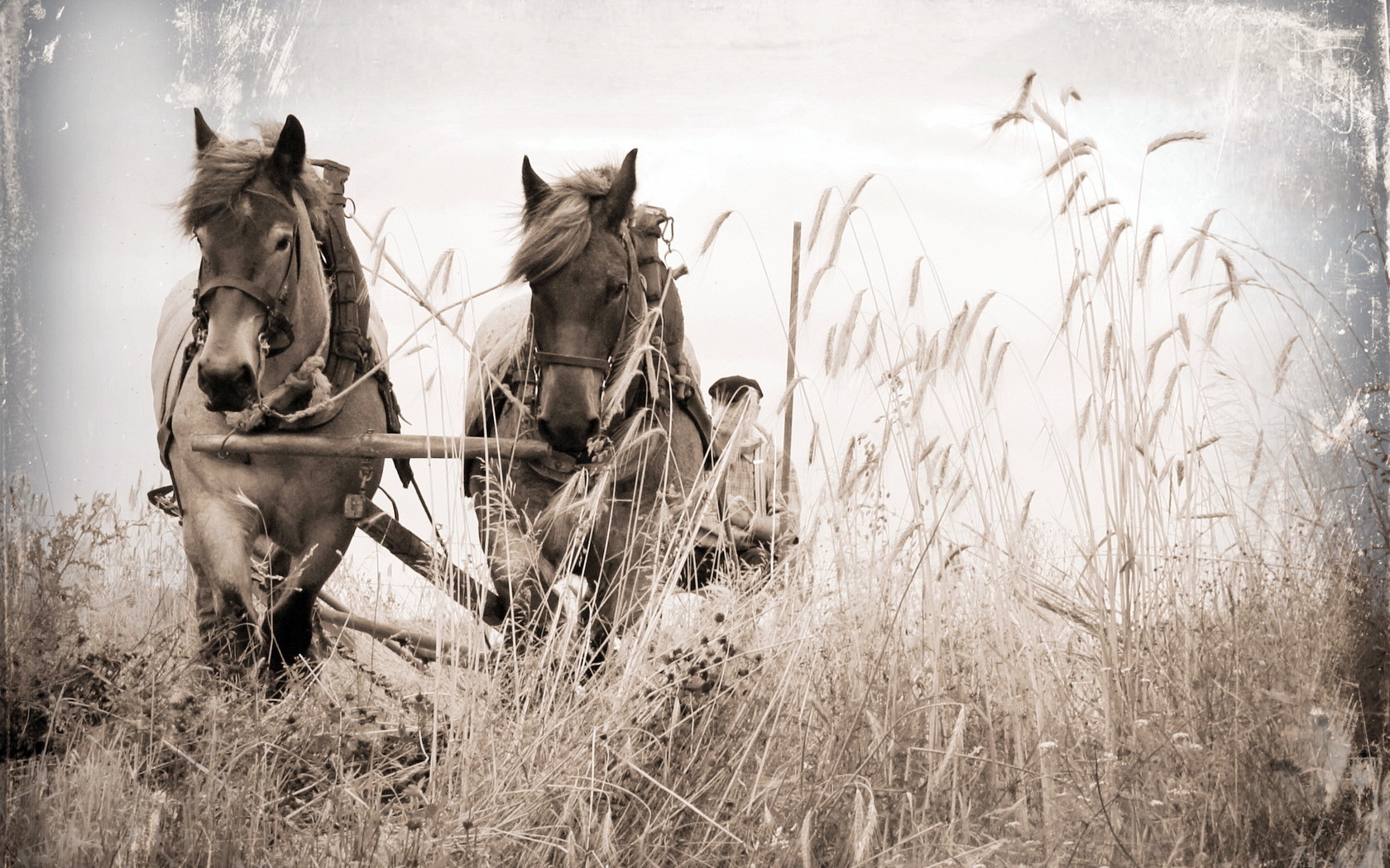 Description: Two horses pulling a plow through a field of tall grass with a sky background in sepia tone.