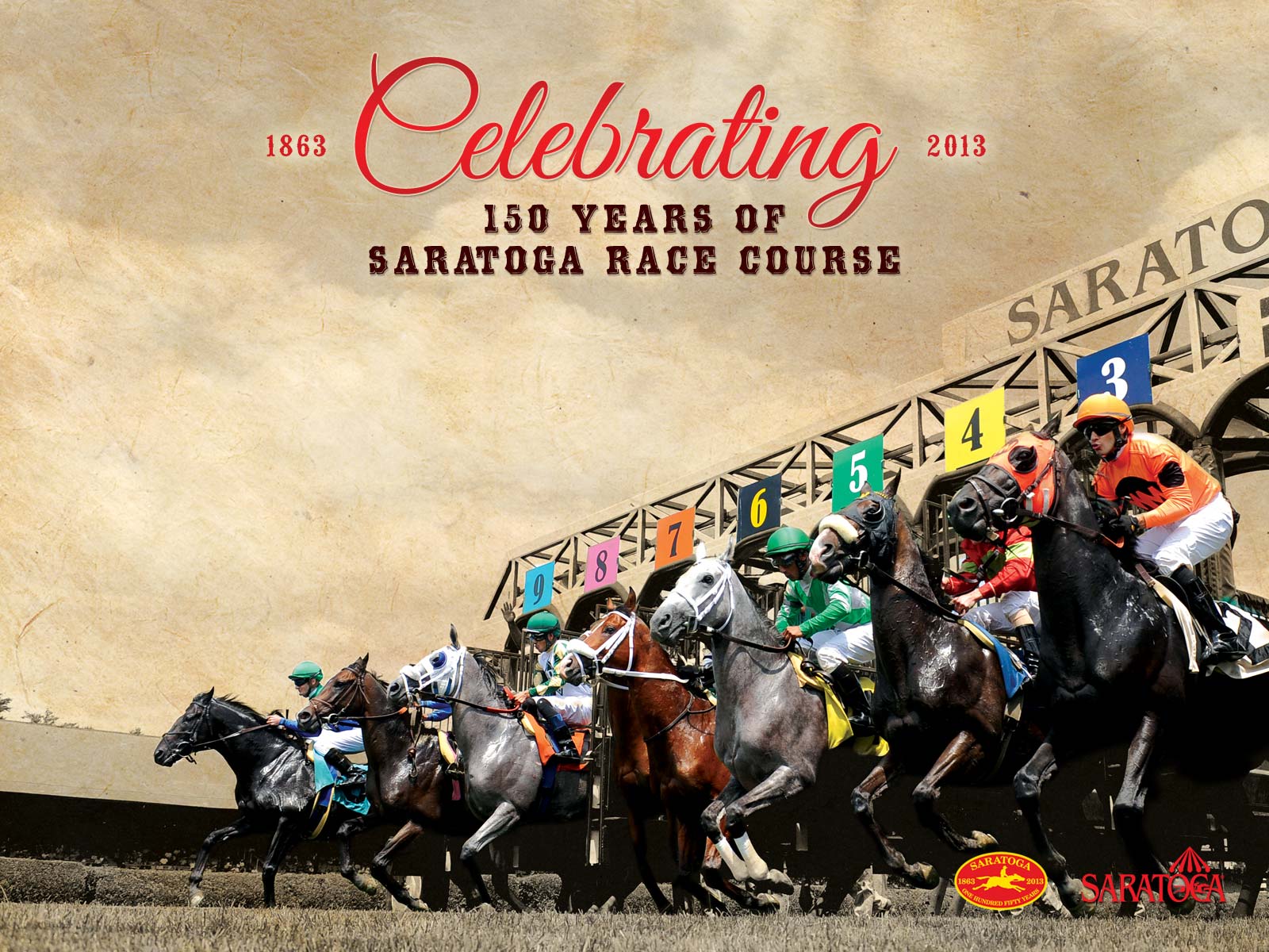 Description: A group of horses racing down a race track with a banner in the background that says celebrating 150 years of saratoga race course.