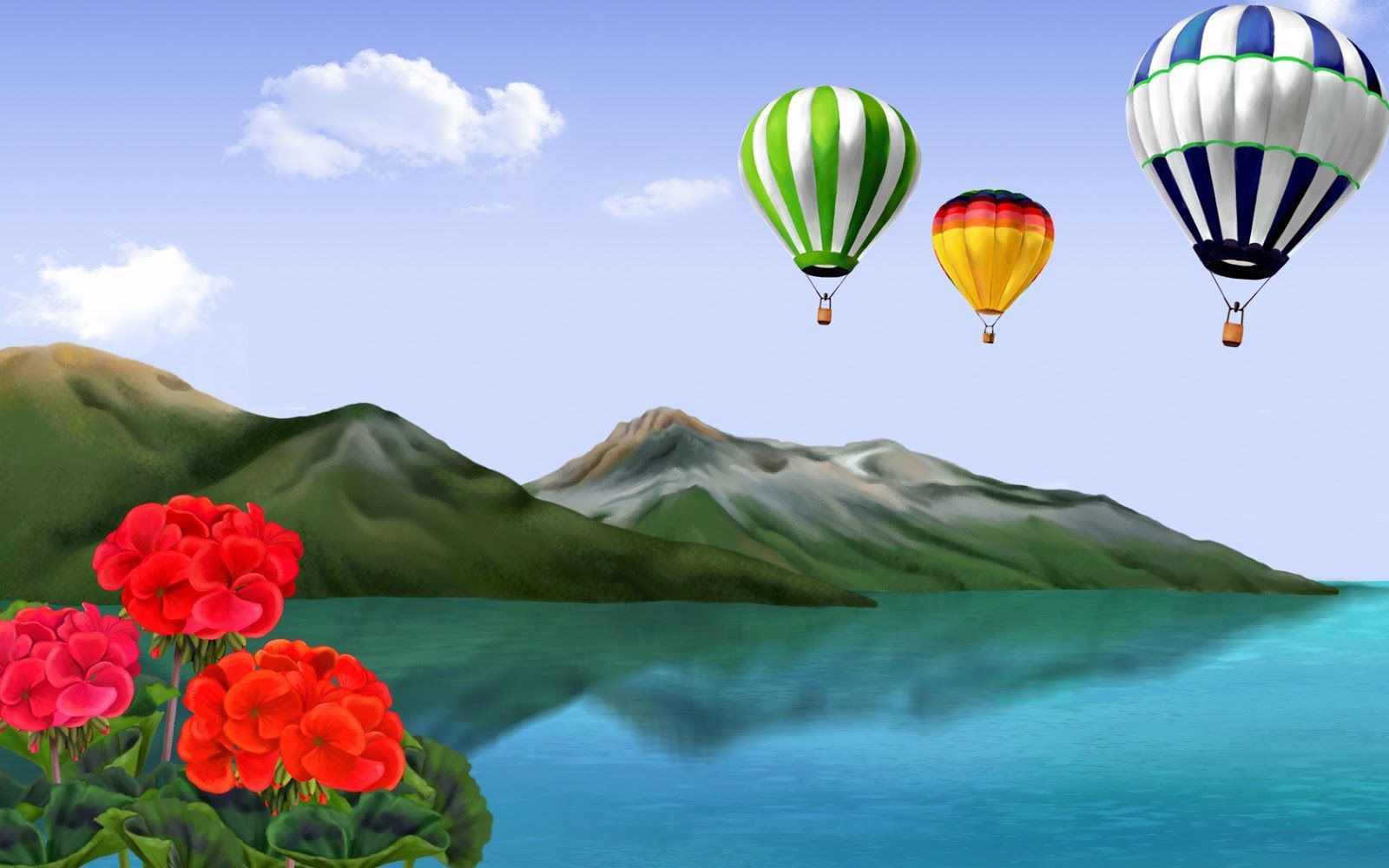Description: A painting of three hot air balloons flying over a lake and mountains with flowers in the foreground and a mountain range in the background.