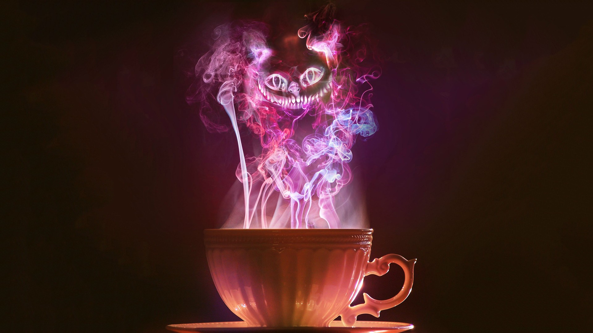 Description: A cup of hot tea with a strange looking face on it's side and steam rising from the top.