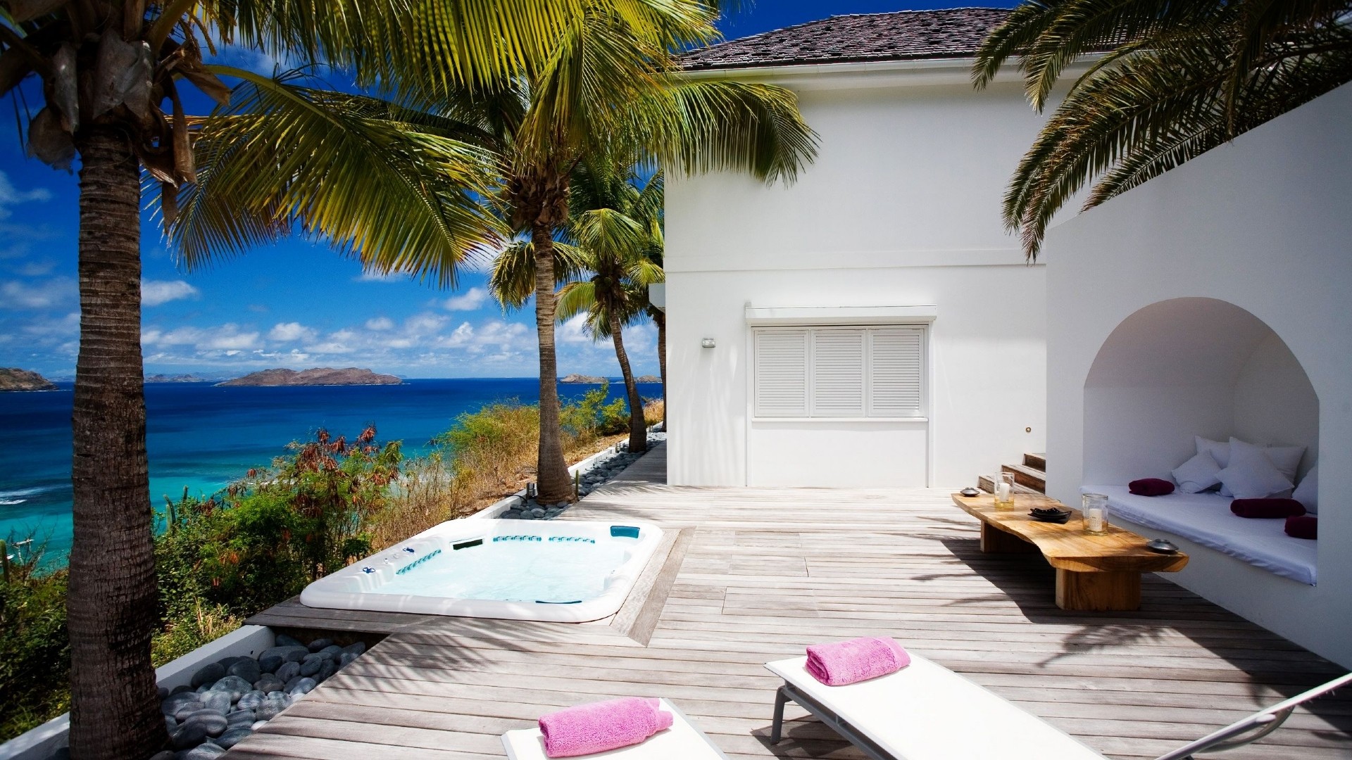 Description: A hot tub sitting on top of a wooden deck next to a beach with palm trees and a blue ocean.