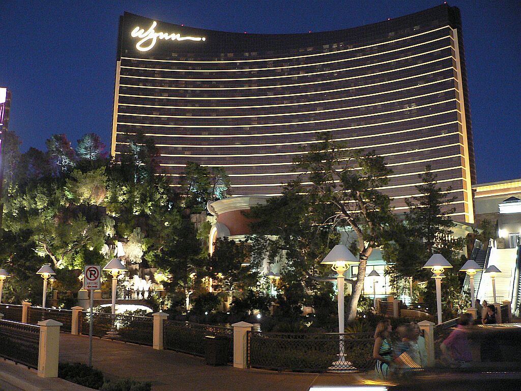 Description: A hotel and casino at night with people sitting outside the building and a street light in front of it.