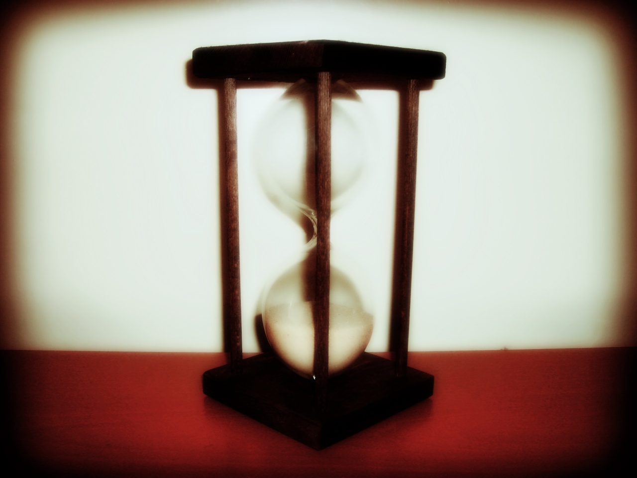 Description: A hourglass with a person's face in the middle of it and a red table underneath it.