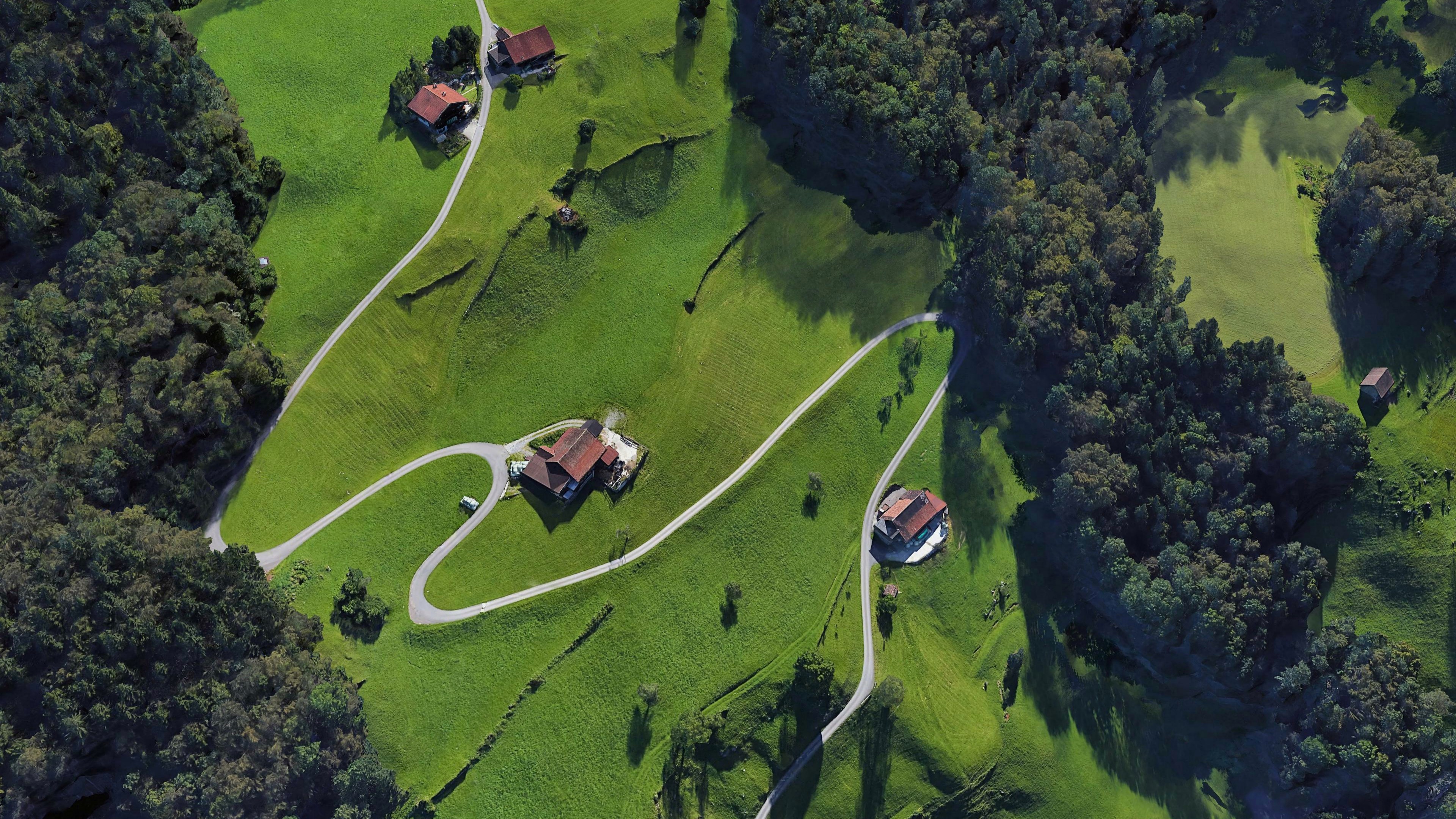Description: A house in the middle of a lush green field with a winding road in the middle of it and a house on the other side of the road.