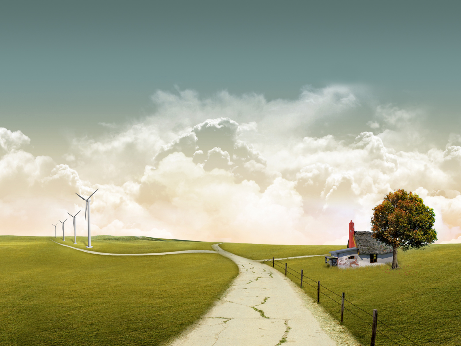 Description: A house on a hill with a path leading to it and wind mills in the distance in the distance.