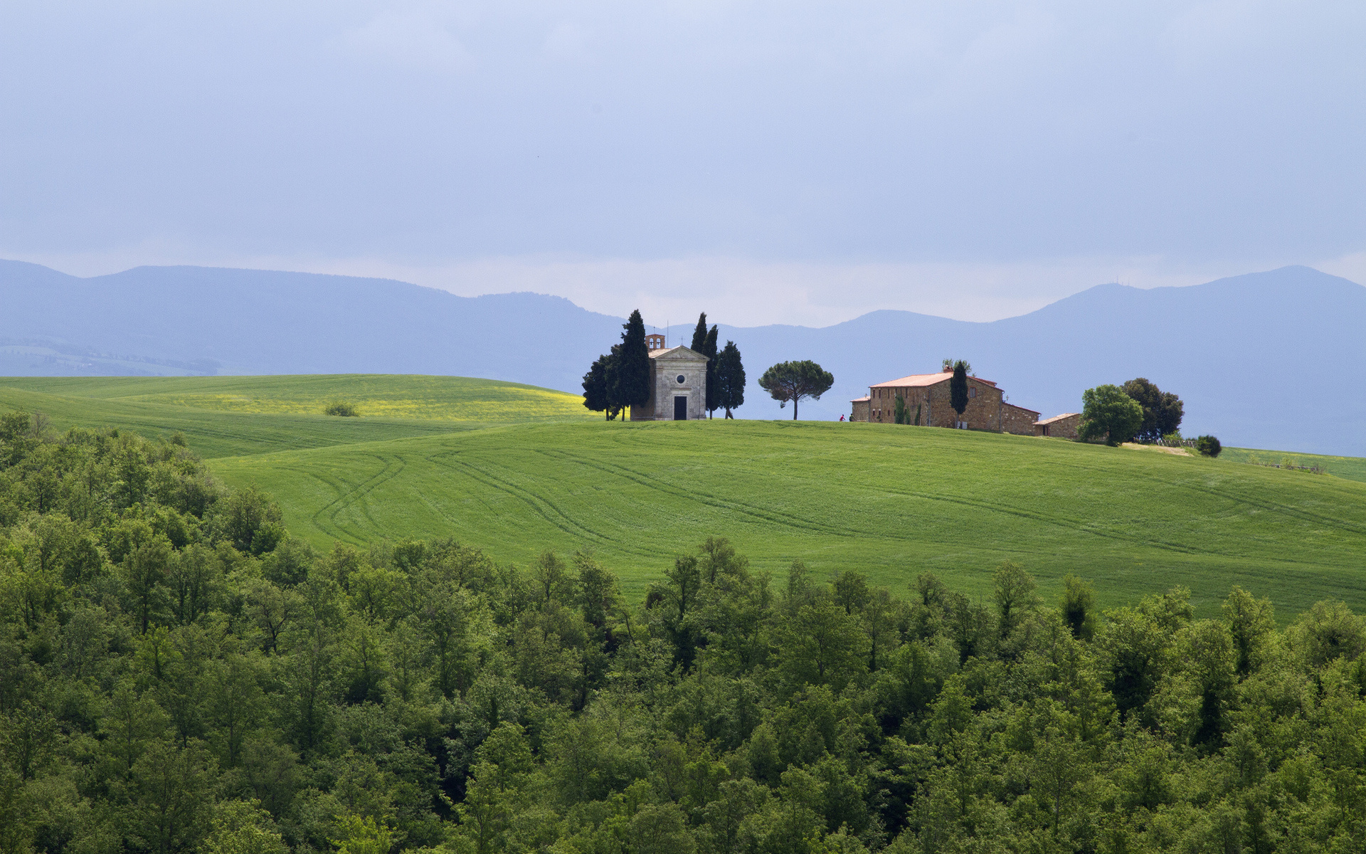 Description: A house on a hill with trees in the foreground and mountains in the background.
