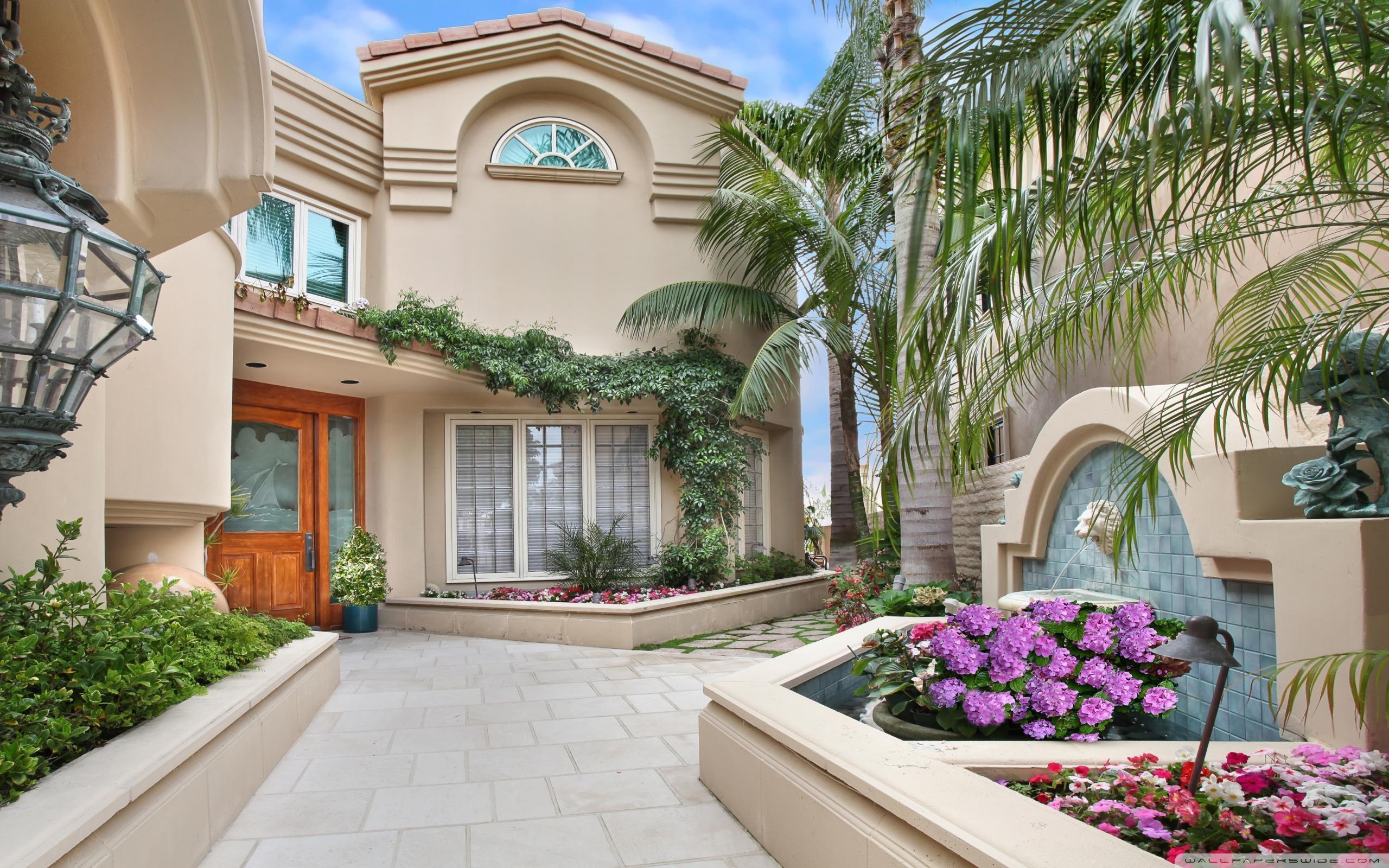 Description: A house with a lot of plants and flowers in the front yard of it and a light pole in the back.