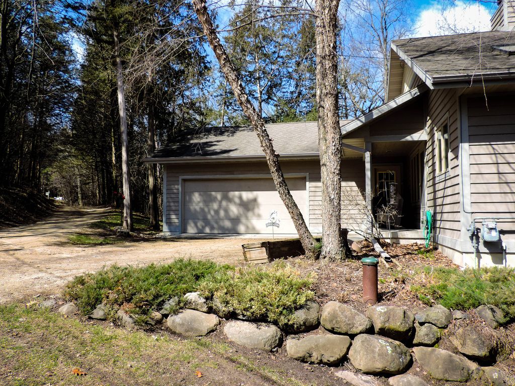 Description: A house with a rock wall in front of it and a tree in the yard behind it and a rock wall in front of it.