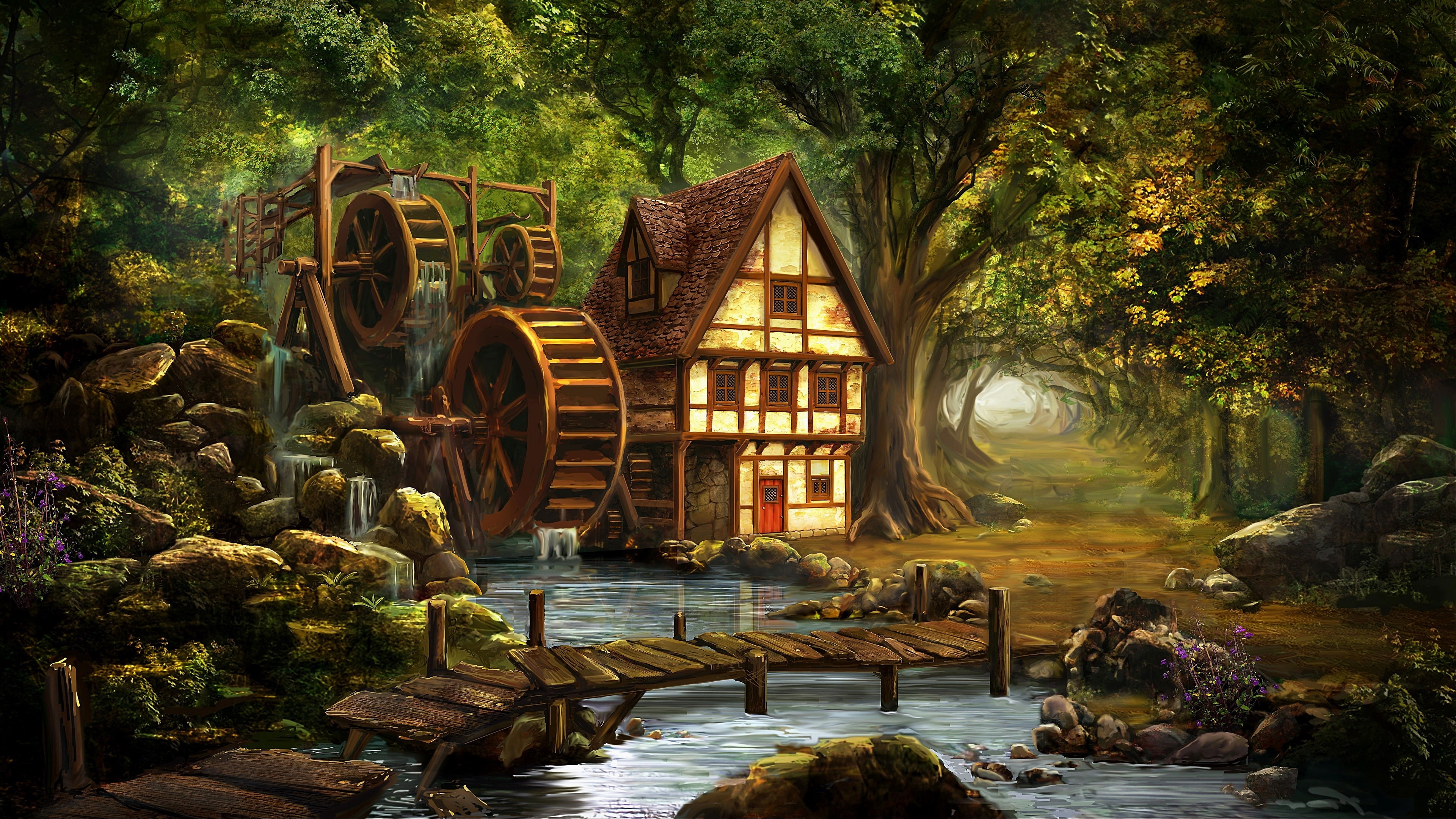 Description: A painting of a house in the woods with a water wheel in the background and a stream running through the center.