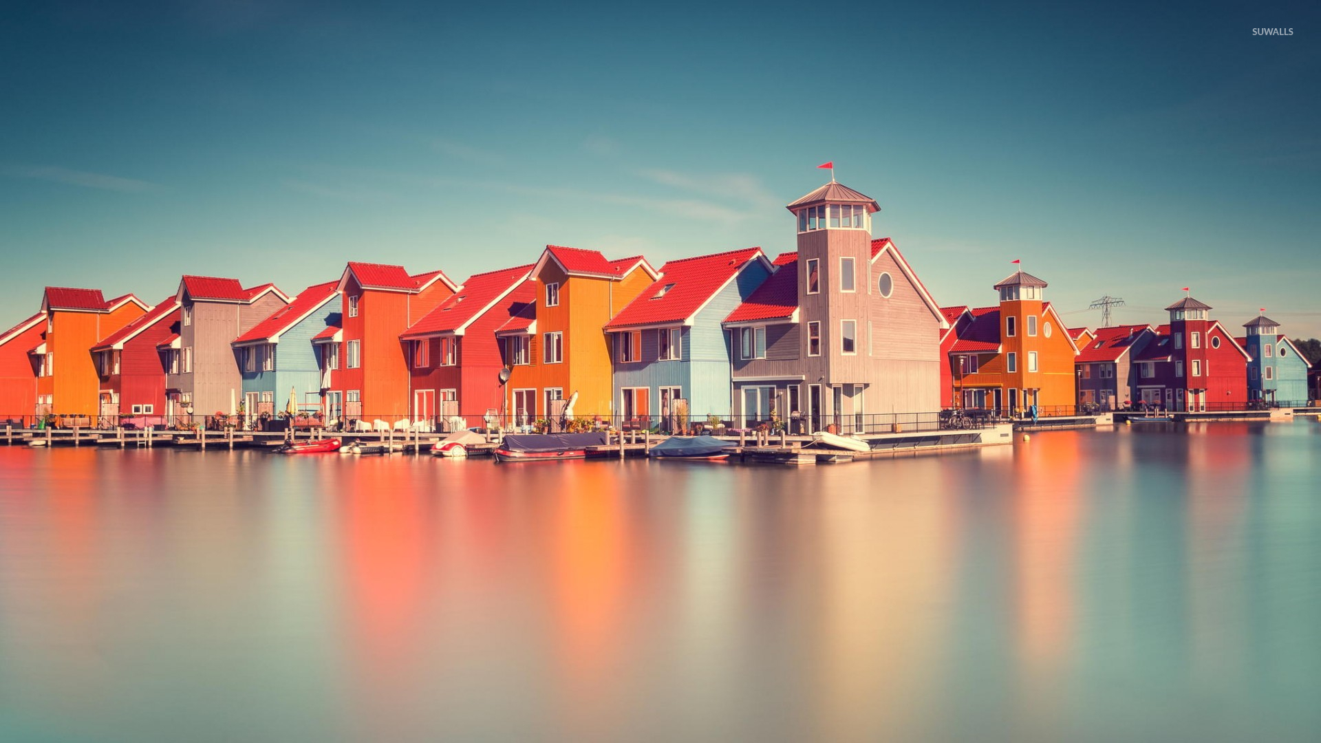 Description: A row of houses sitting on top of a lake next to a dock with boats parked on it's sides.