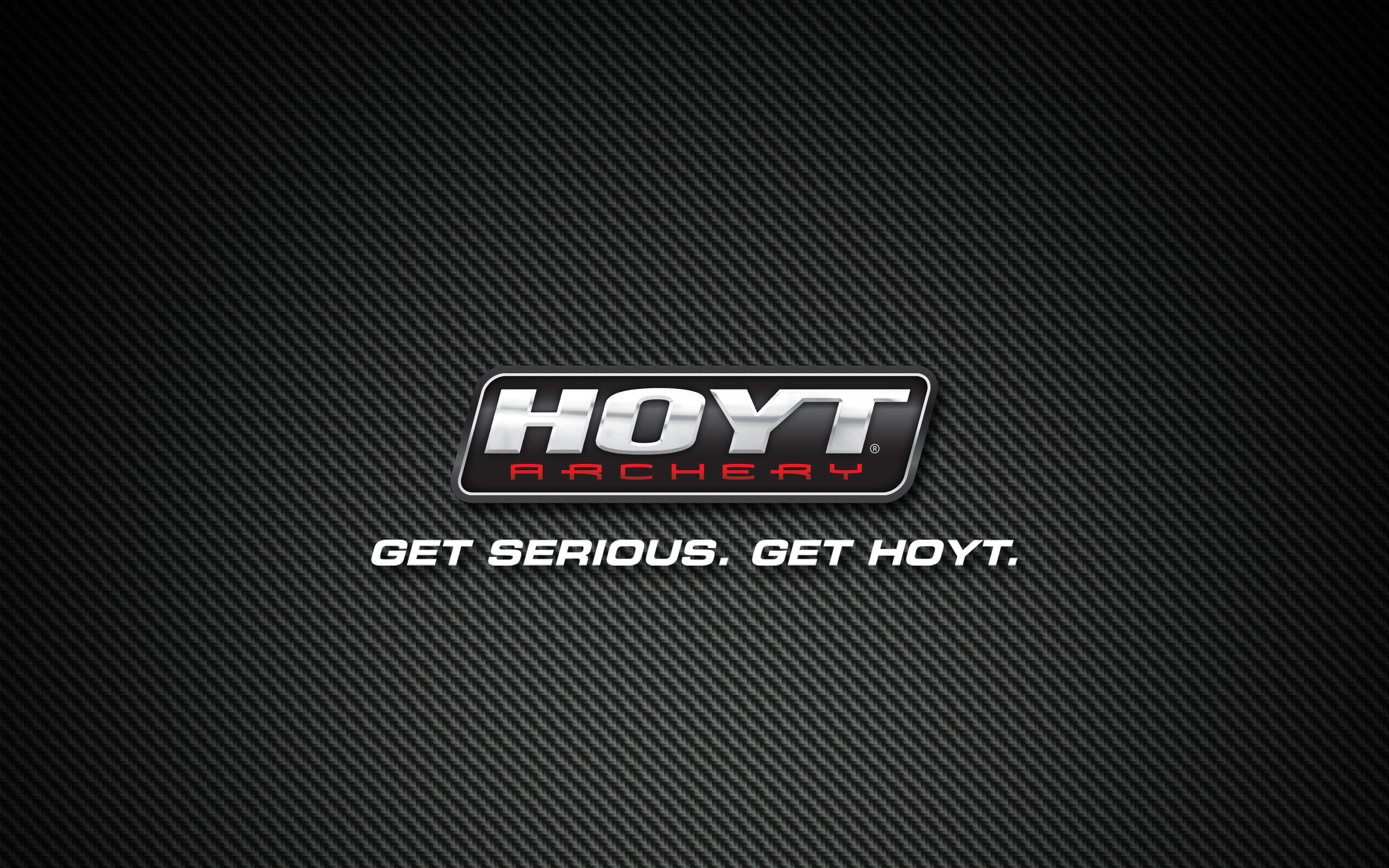 Description: A black background with a red and white logo on it and the words hoyt archery get serious.