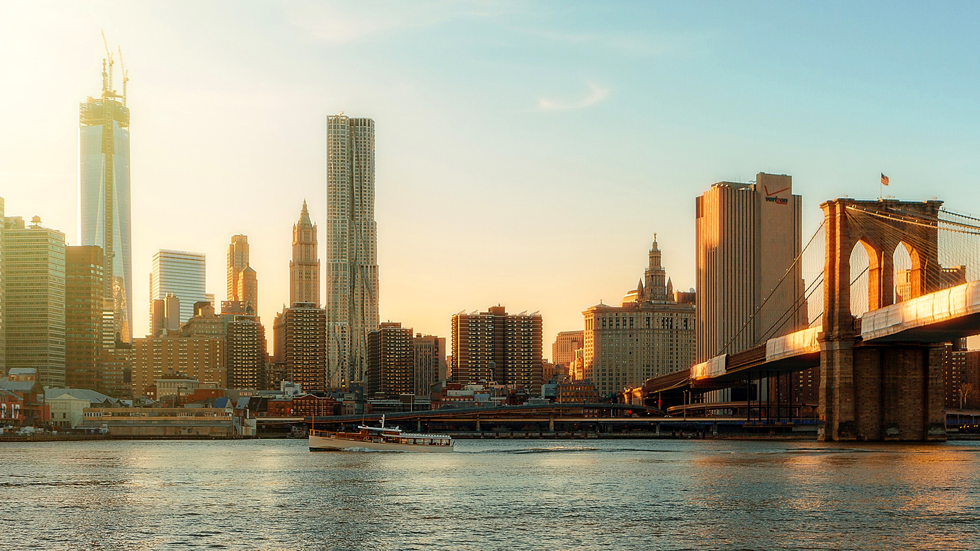 Description: A boat is going under a bridge in a city setting with tall buildings in the background and a boat in the foreground.