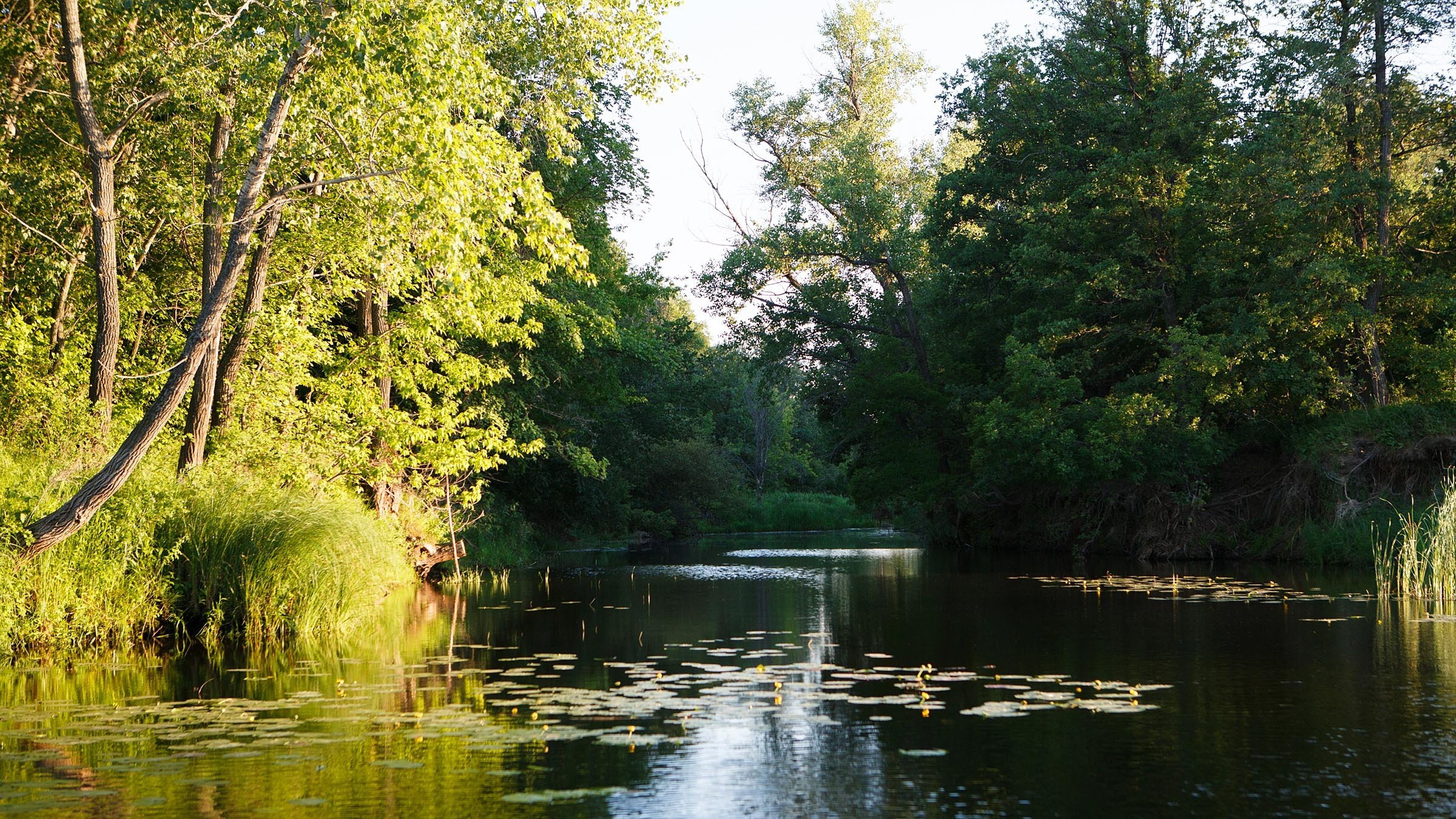 Description: A river with lily pads and trees in the background and a few leaves on the water surface.