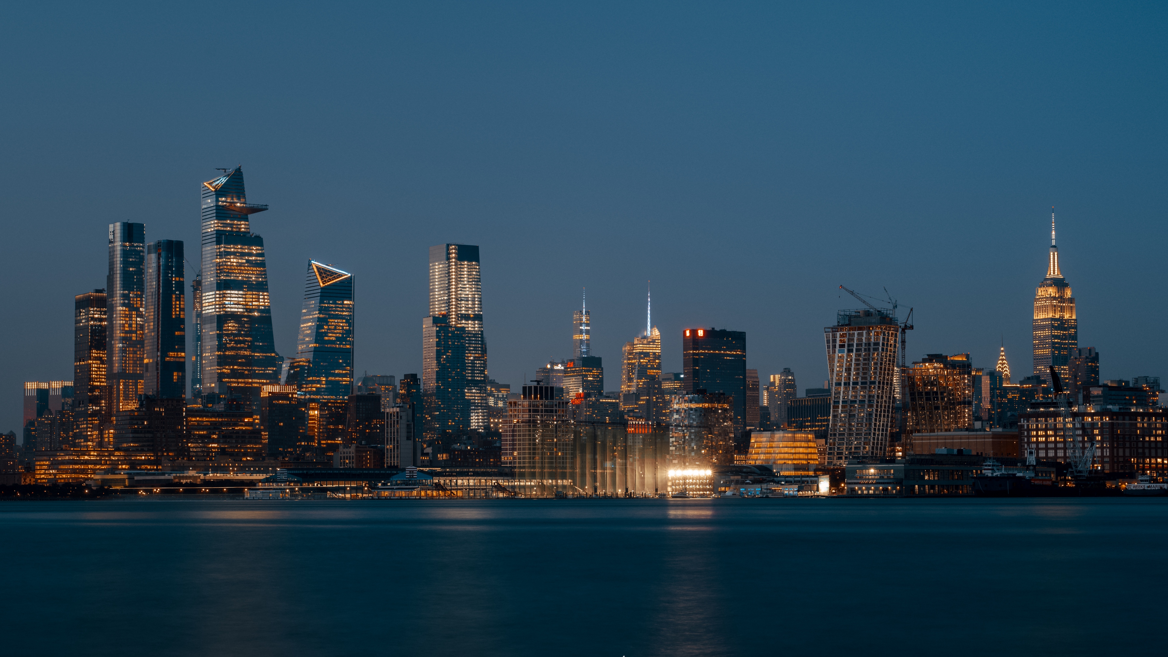 Description: A city skyline at night with a body of water in front of it and a boat in the foreground.