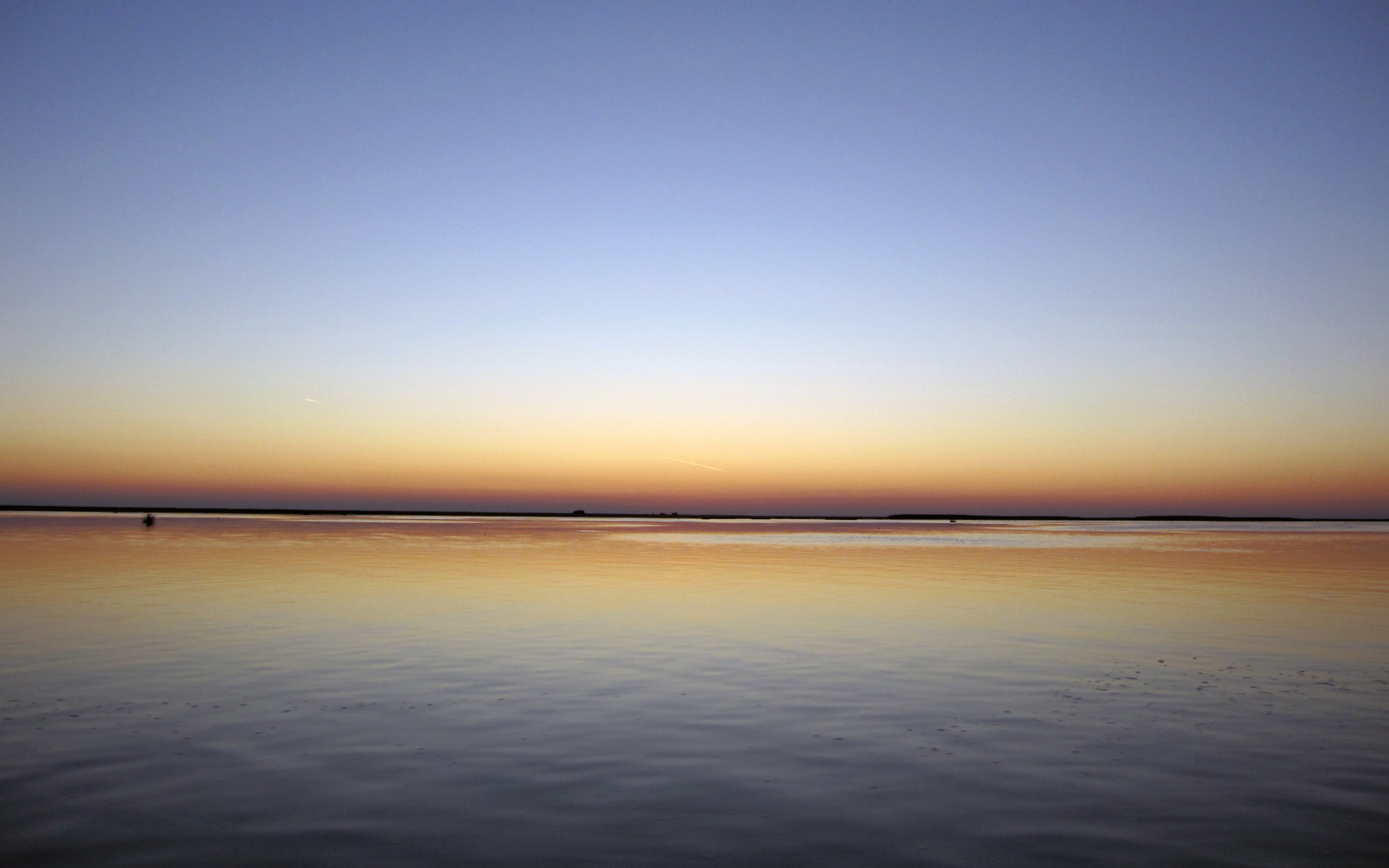 Description: A body of water with a sky in the background and a person standing in the water at sunset or dawn.