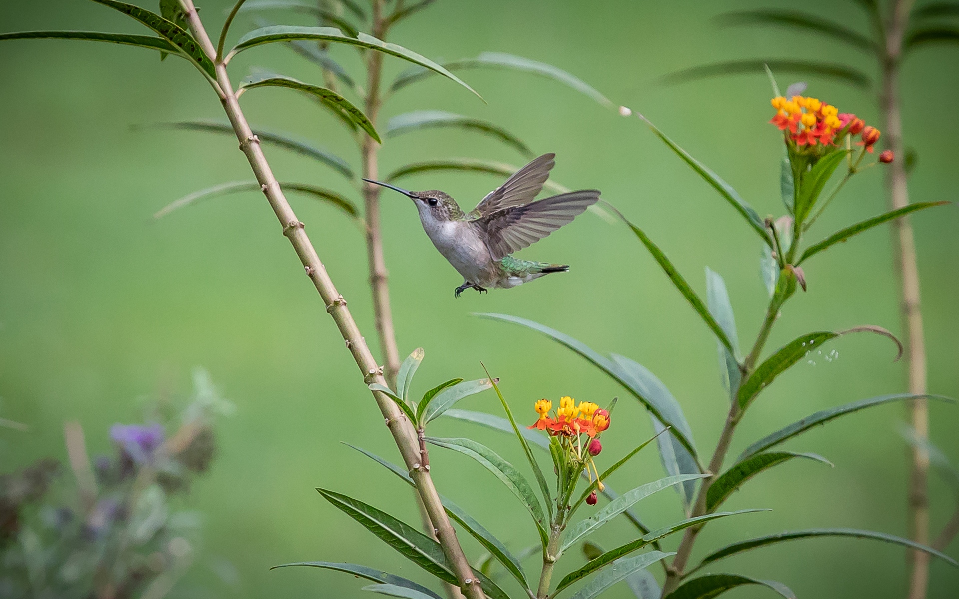 Description: A hummingbird flying over a flower in a field of flowers and grass with a green background and a small yellow flower.