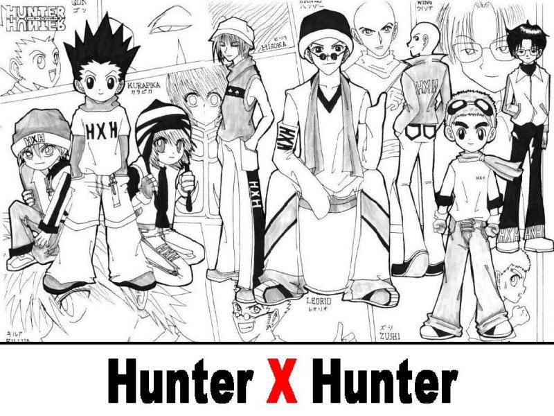 Description: A group of people standing next to each other in front of a poster with the words hunter x hunter.