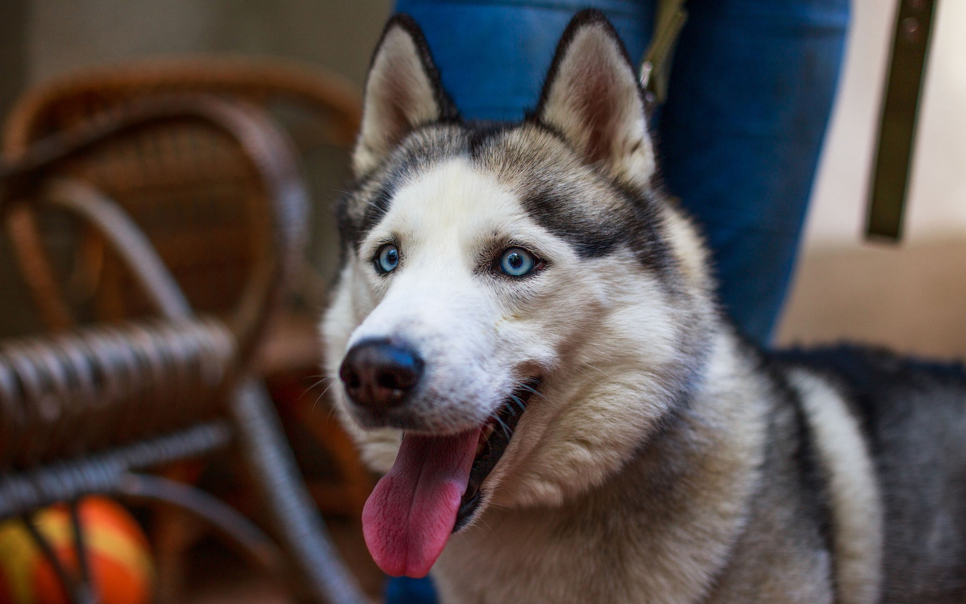 Description: A husky dog with its tongue hanging out looking at the camera with a person's legs in the background.