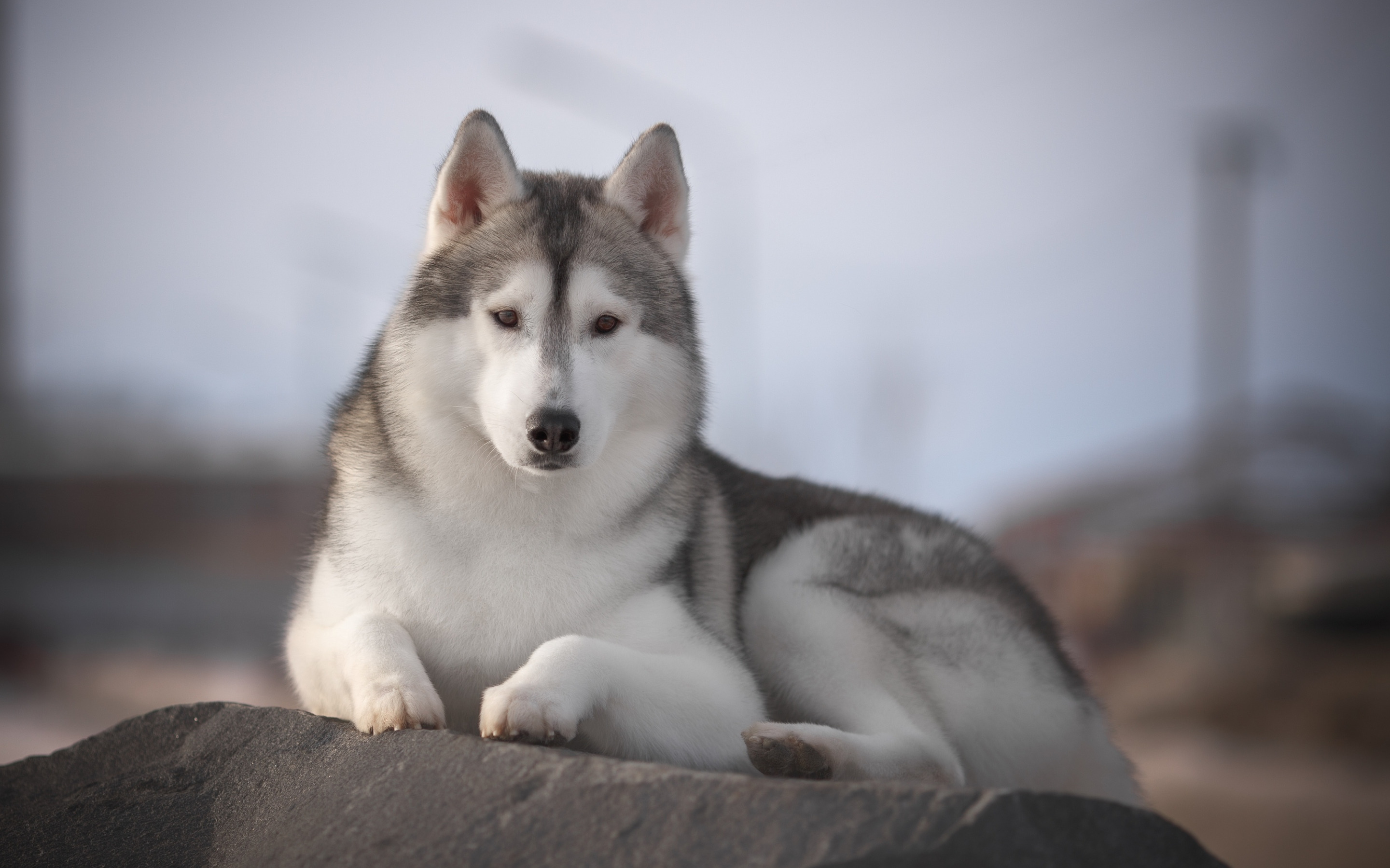 Description: A husky dog sitting on a rock looking at the camera with a blurry background of the picture behind him.