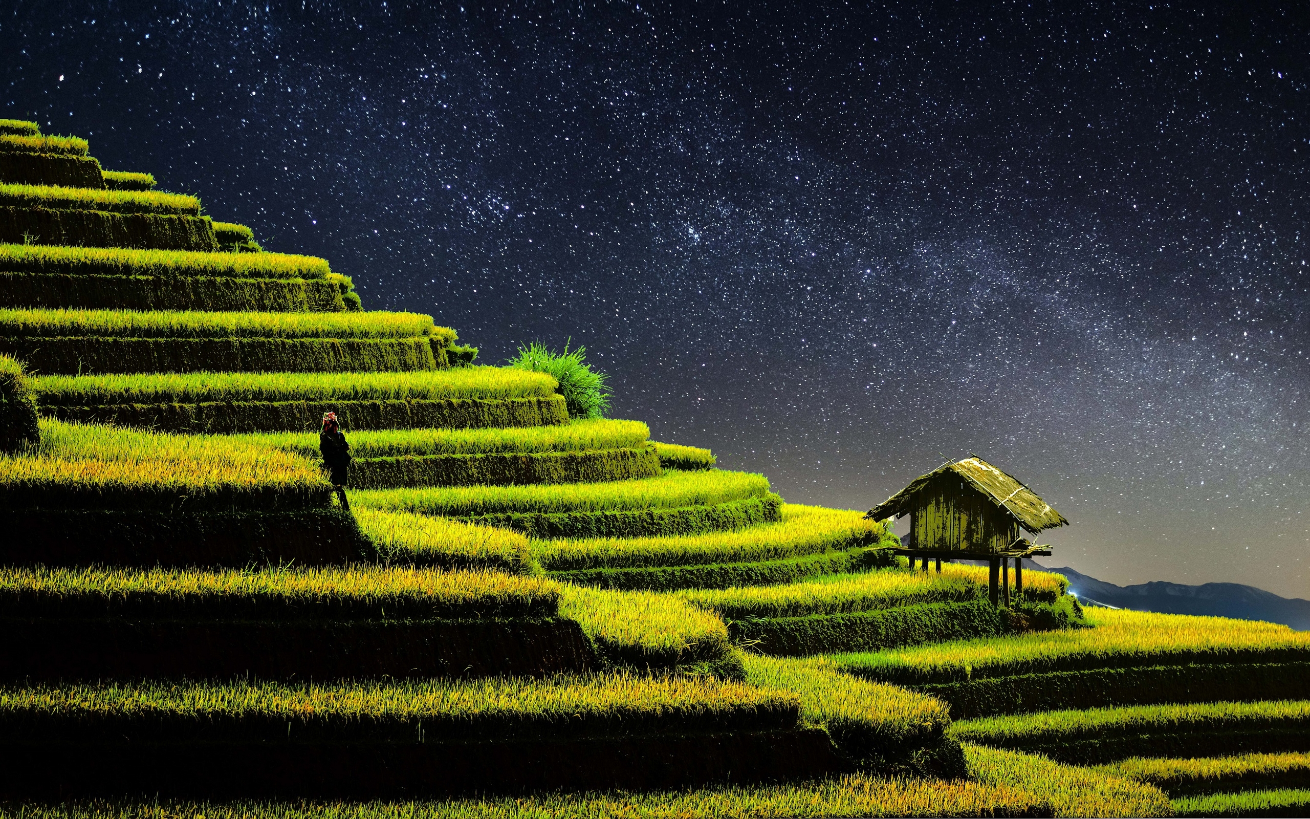 Description: A hut on a grassy hill under a night sky with stars above it and a person standing on the top of the hill.