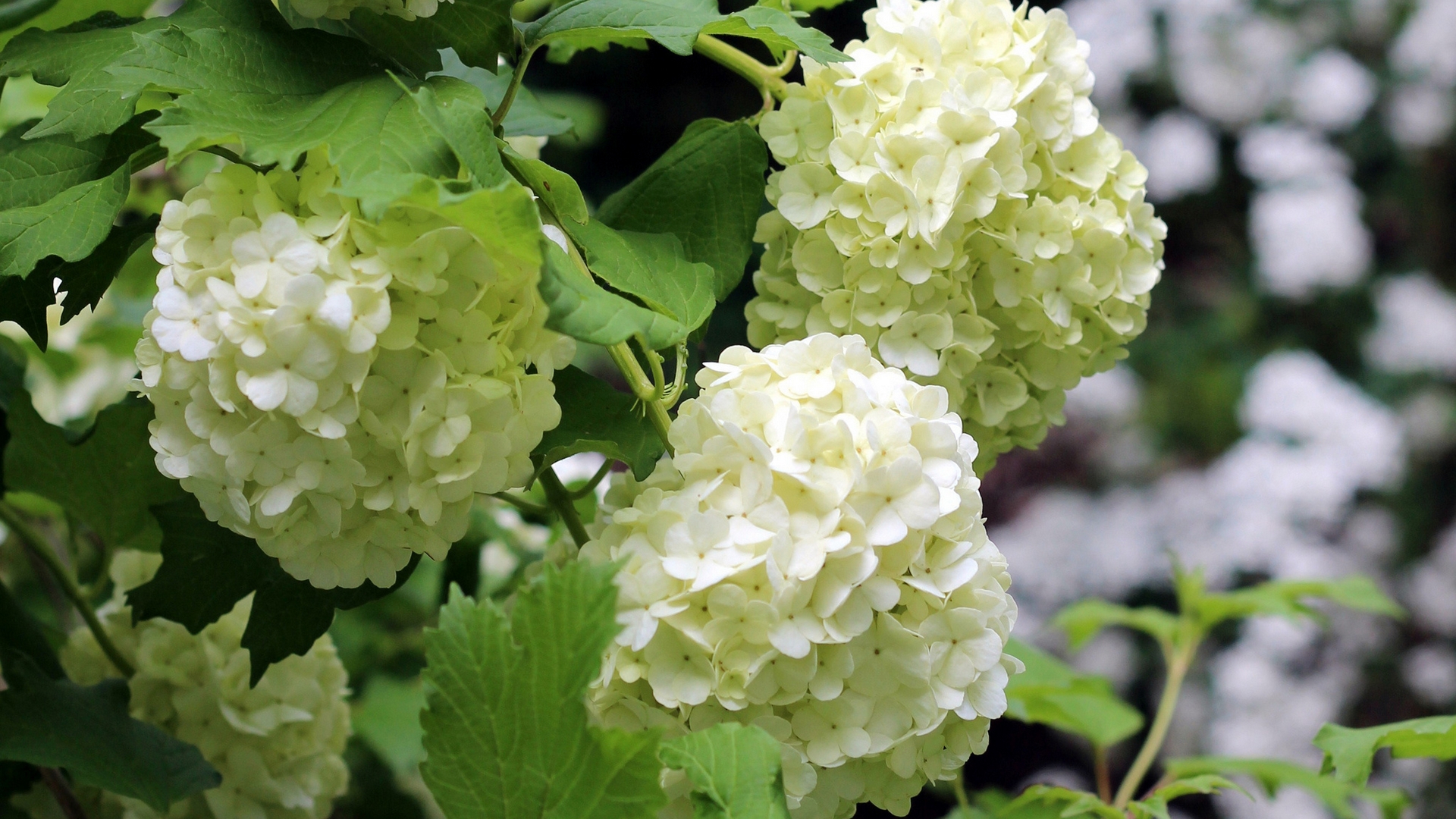 Description: A close up of a bunch of flowers on a tree branch with leaves and flowers in the background.