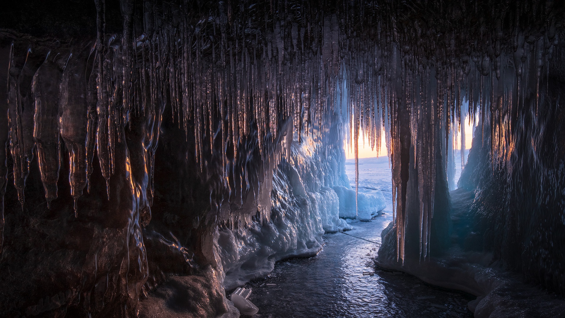 Description: A cave with ice hanging from the ceiling and water flowing down the side of it.
