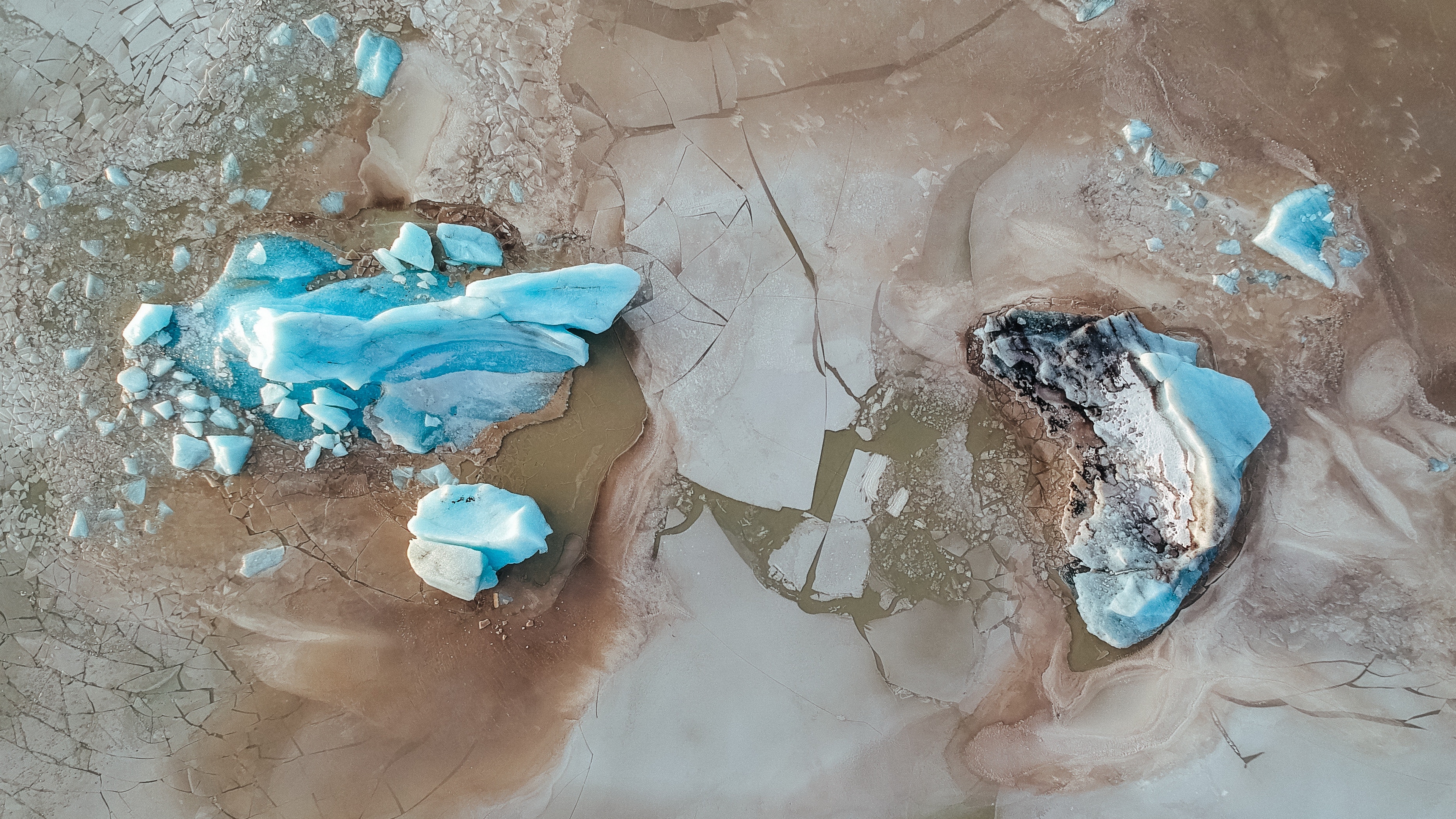 Description: A couple of ice chunks sitting on top of a river next to a river bed of water with ice chunks on it.