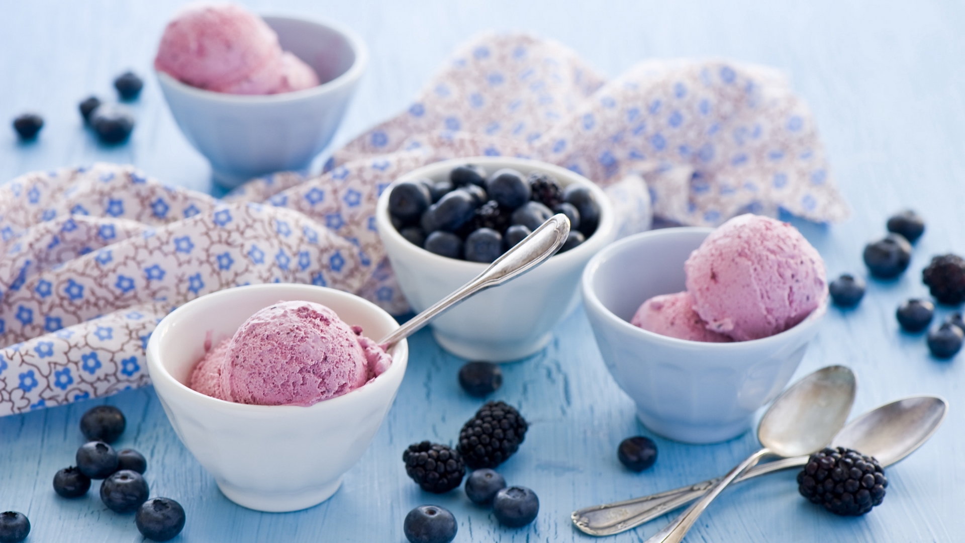Description: A table topped with bowls of ice cream and berries next to spoons and a napkin with a blue design.