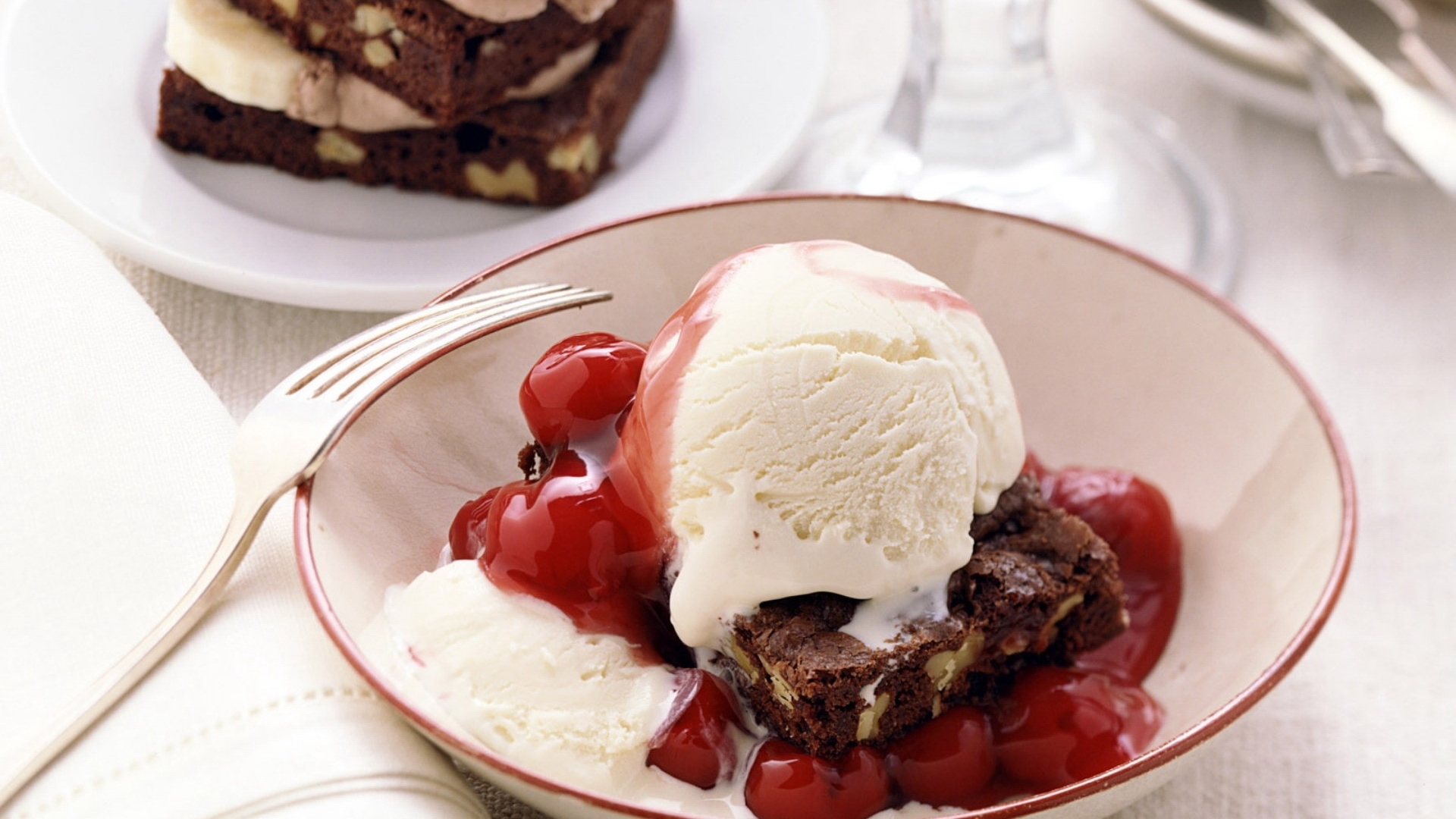 Description: A bowl of ice cream and a plate of brownies with cherries on them on a table with silverware.