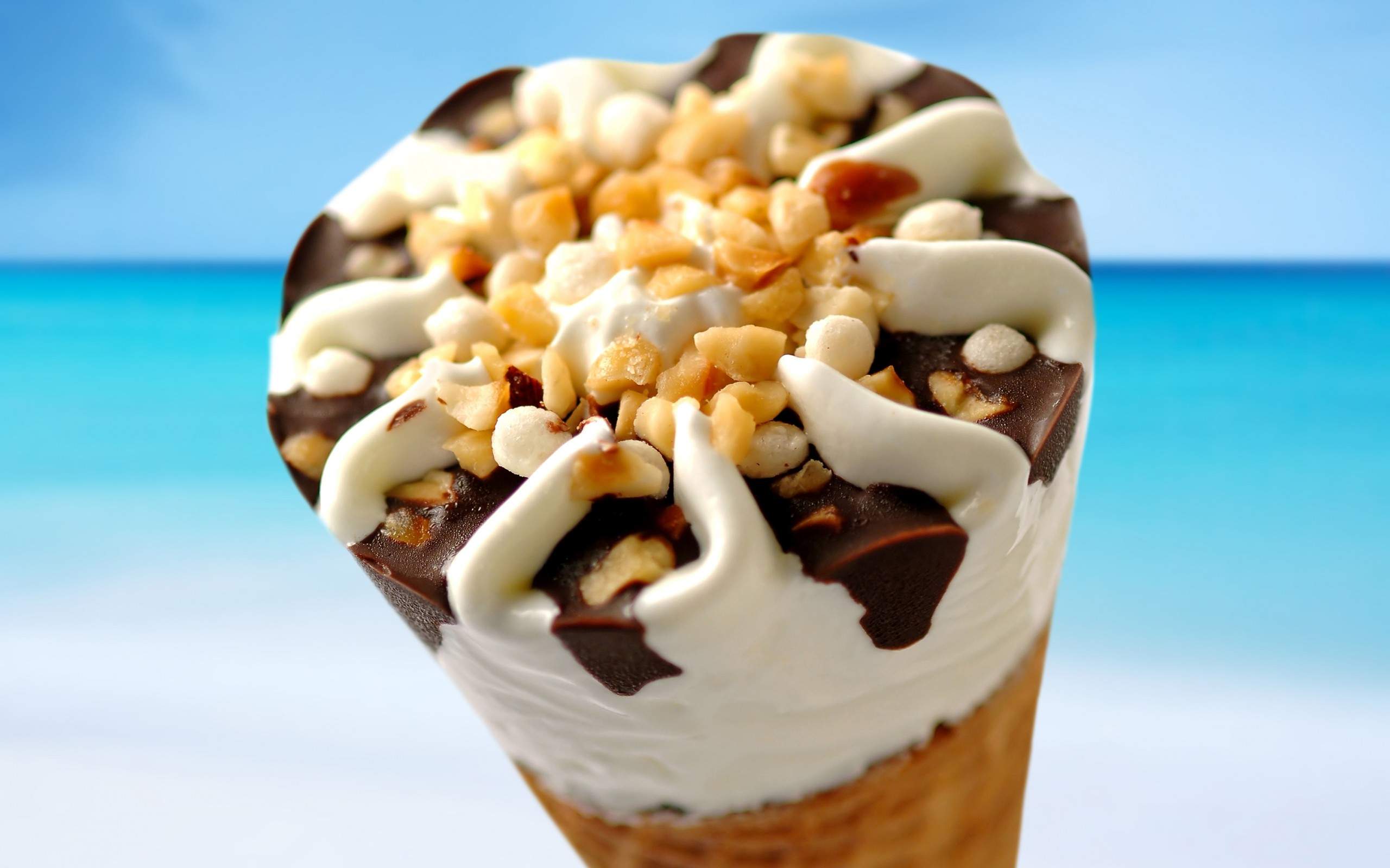 Description: A close up of a ice cream cone with chocolate and marshmallows on top of it.