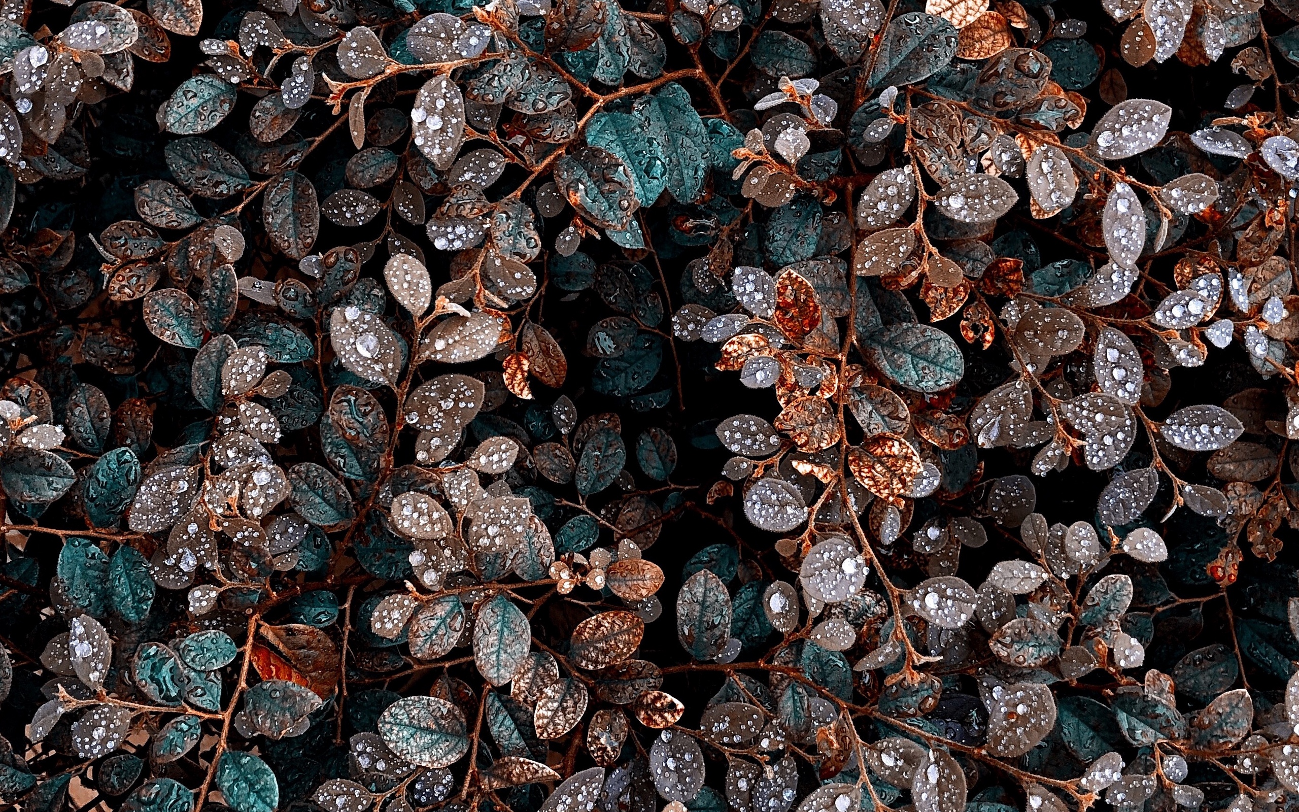 Description: A close up of a bunch of leaves covered in ice and water droplets on a black background with a red stop sign.