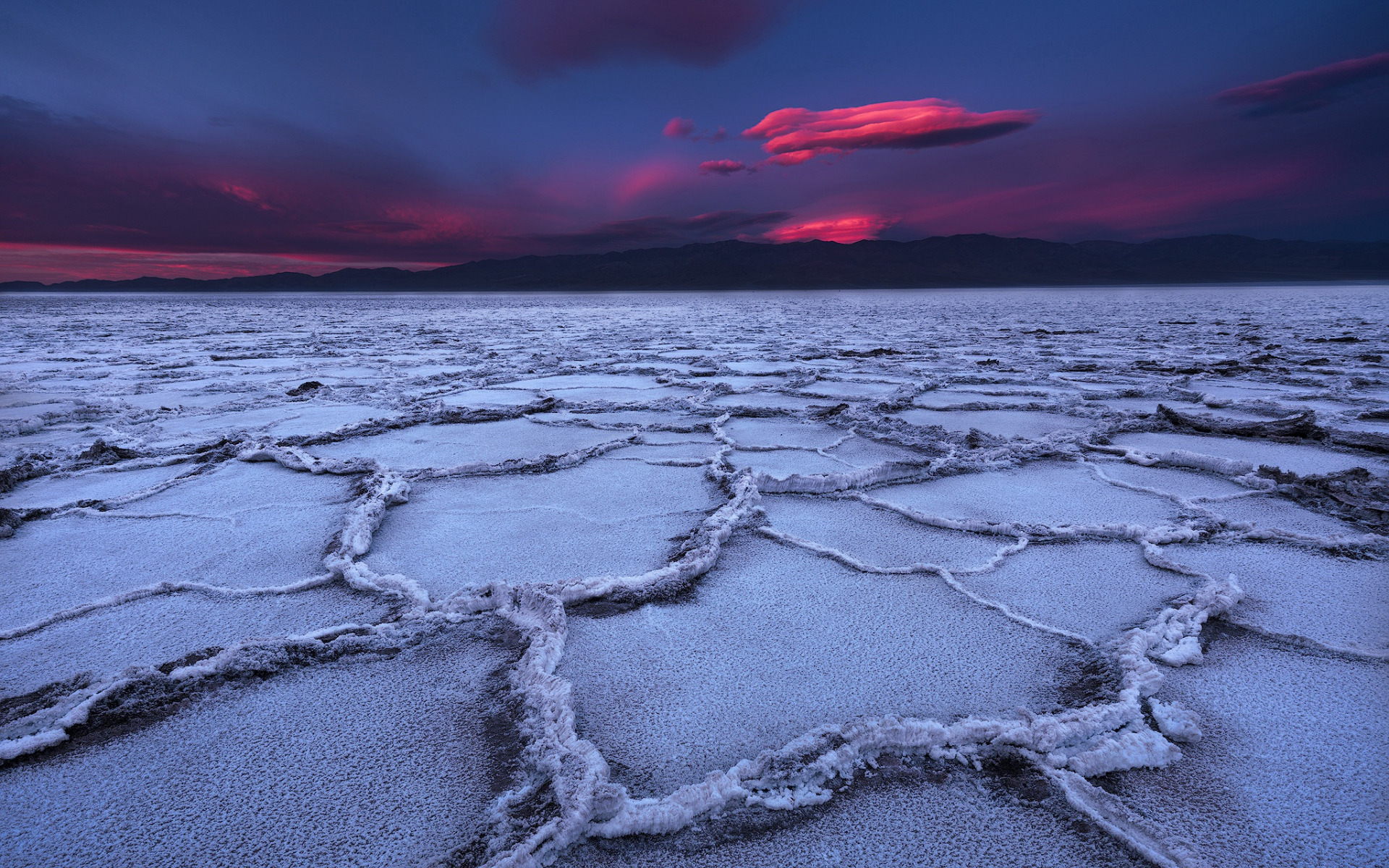 Description: A vast expanse of ice with a red sky in the background and mountains in the distance with clouds in the sky.