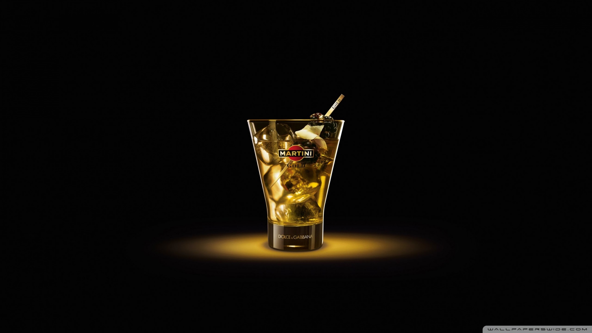 Description: A glass of ice tea with a straw in it on a black background with a light shining on it.