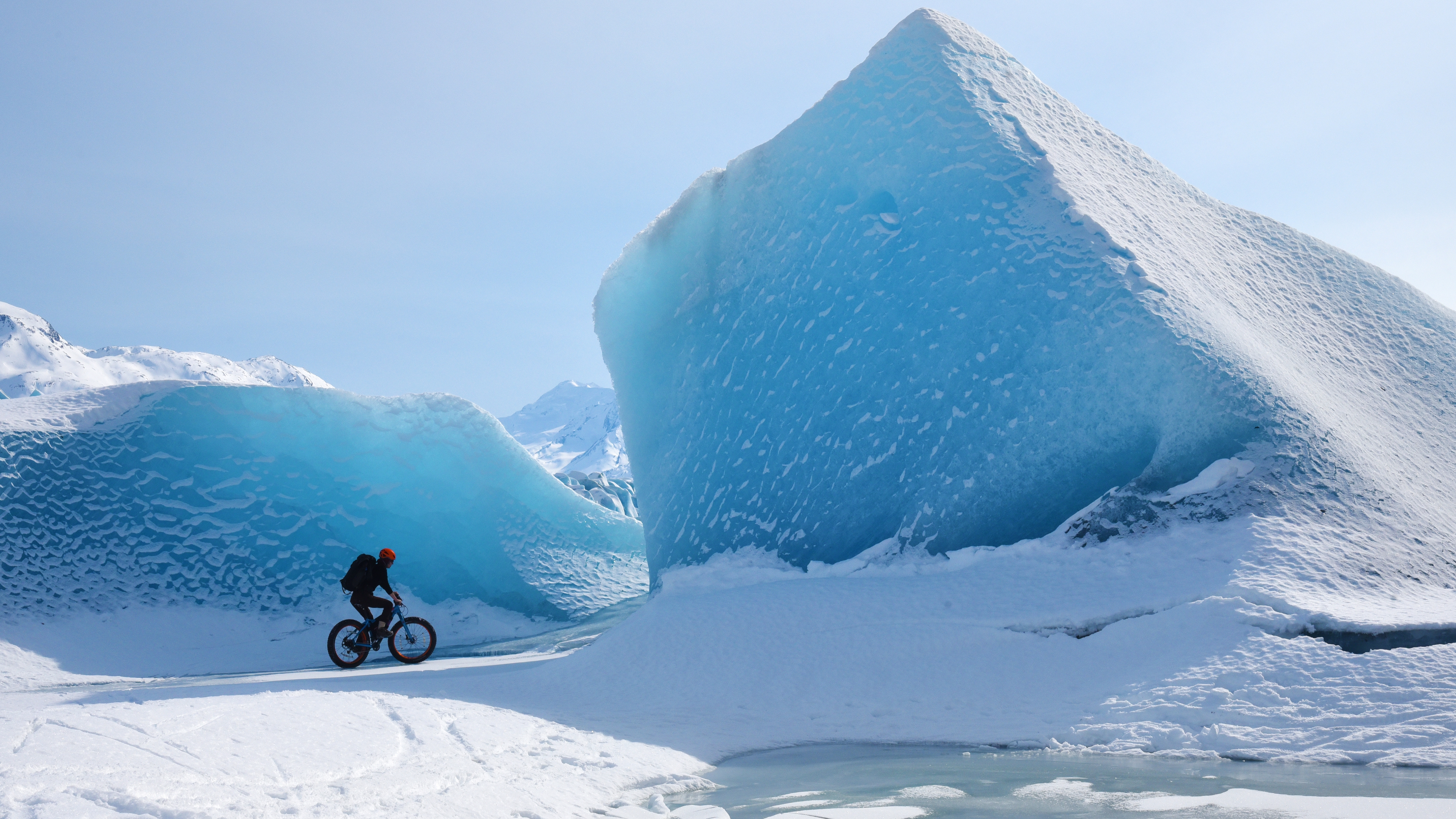 Description: A person riding a bike in front of a large iceberg in the snow with a blue sky in the background.