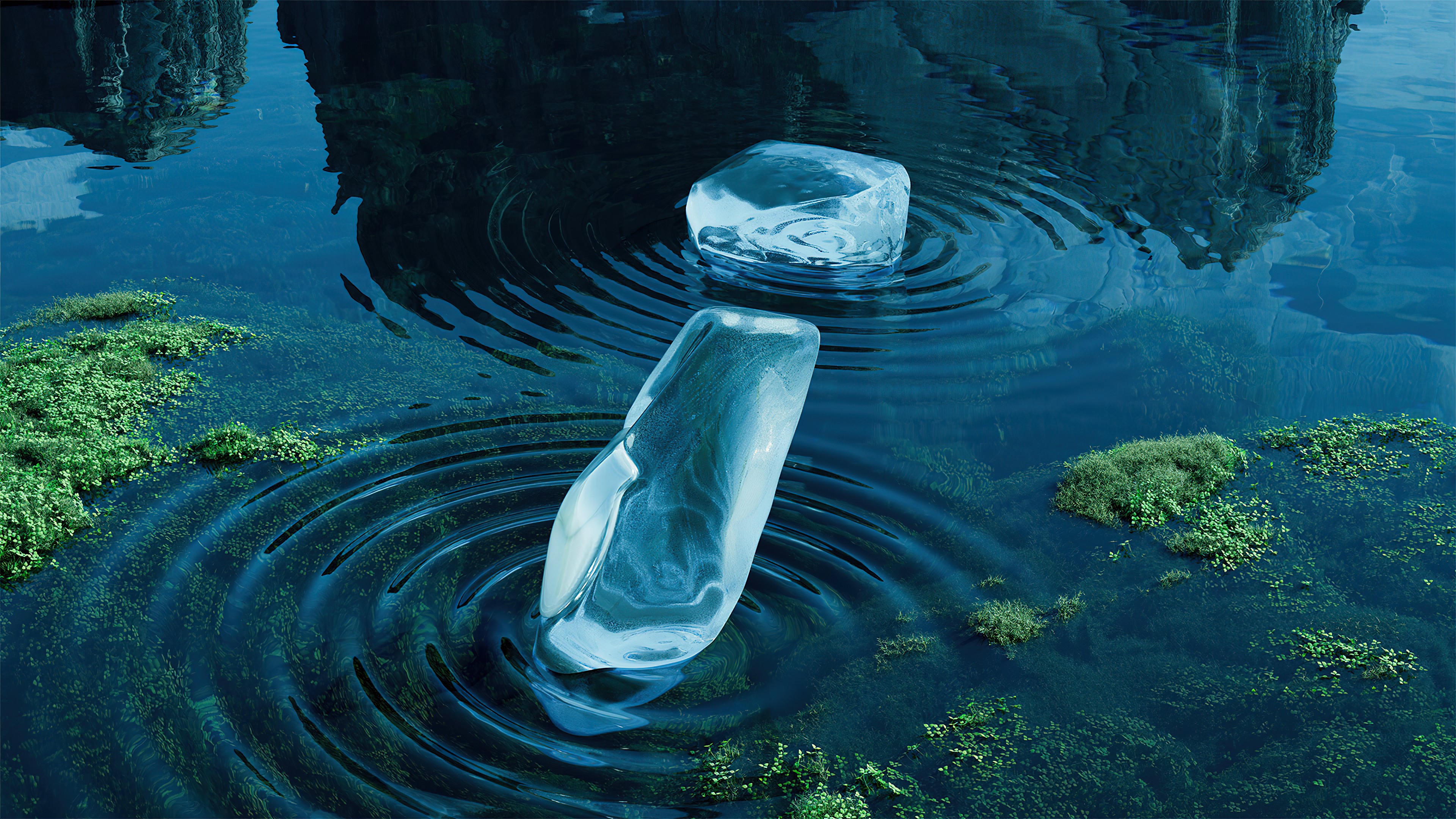 Description: A large iceberg floating in a lake next to a forest of trees and grass.