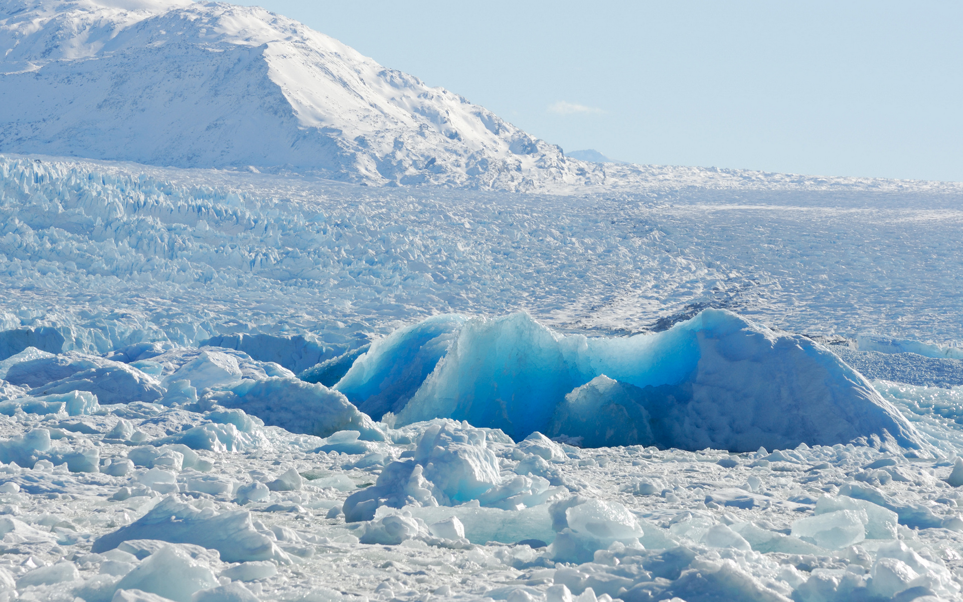 Description: A large iceberg with a mountain in the background and snow on the ground in the foreground.