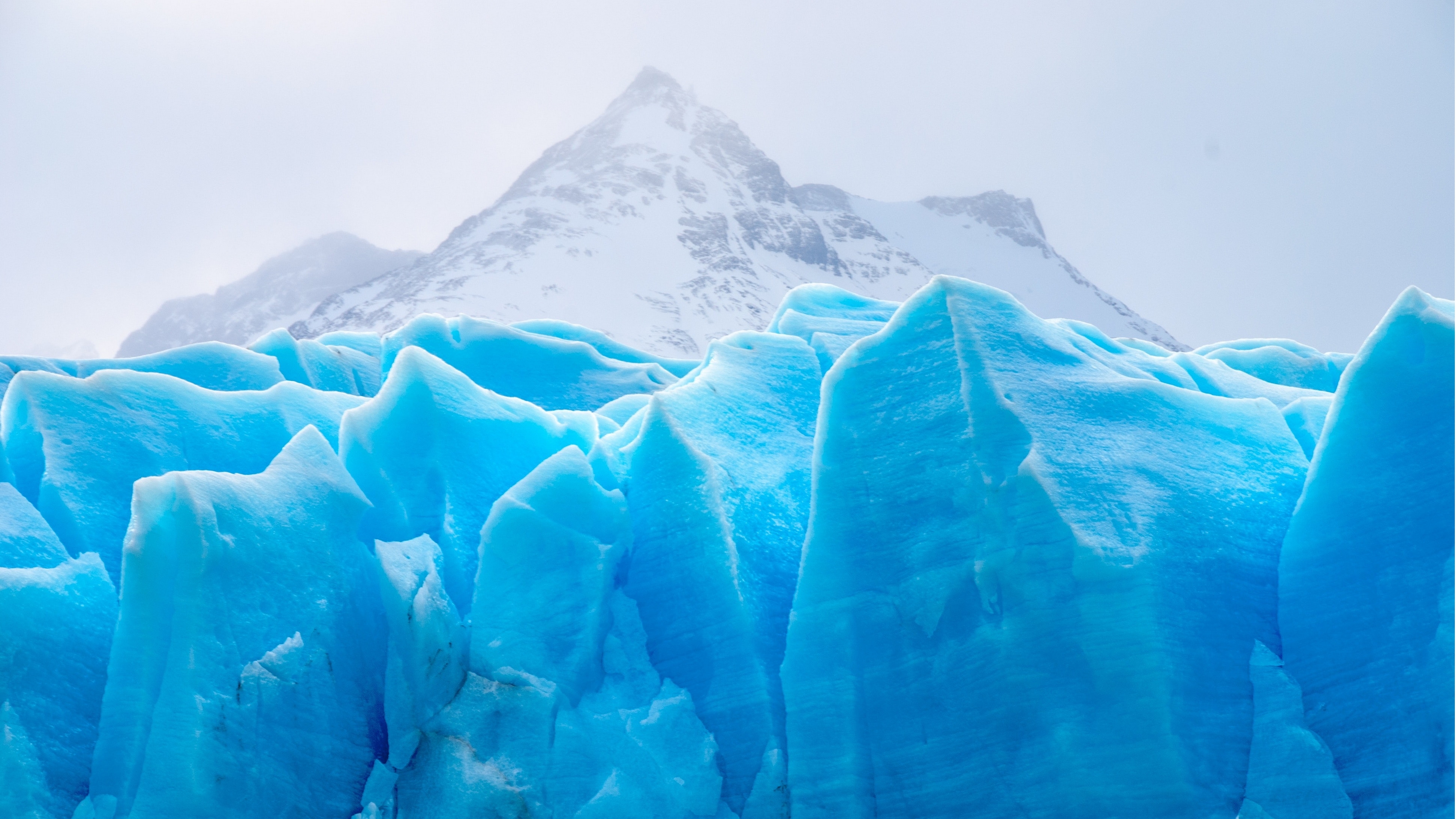 Description: A large iceberg with a mountain in the background in the snow covered area of the photo.