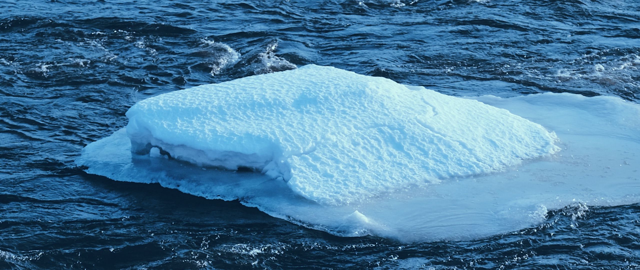 Description: An iceberg floating in the water near a shore line of water with waves coming in and out of it.