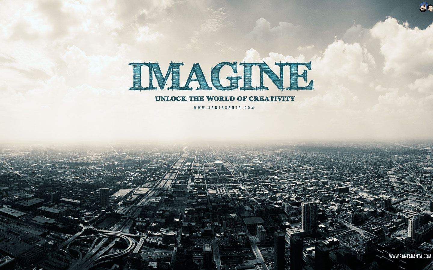 Description: A black and white photo of a city with a sky background and the words imagine on it in a blue font.