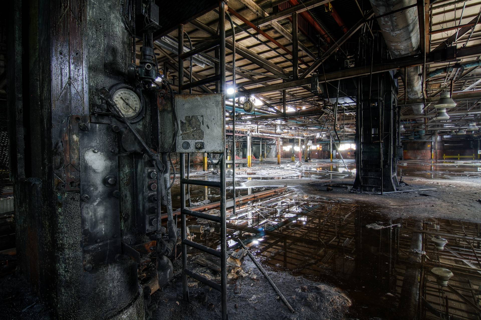 Description: A large industrial building with a clock on the wall and a lot of pipes and wires on the floor.
