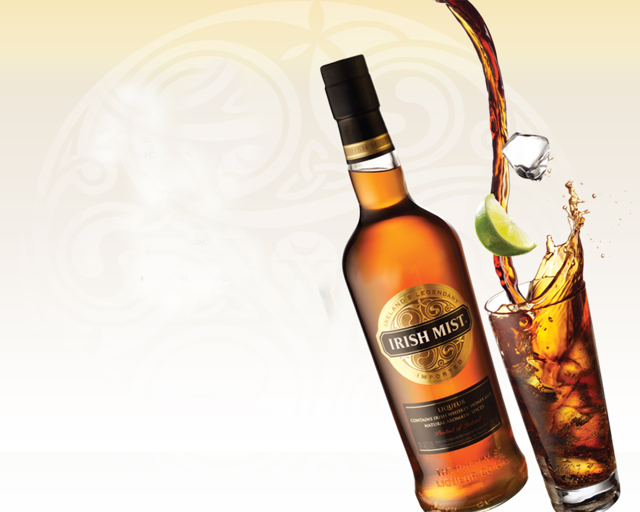 Description: A bottle of irish whiskey being poured into a glass with a lime slice and a lime wedge in it.