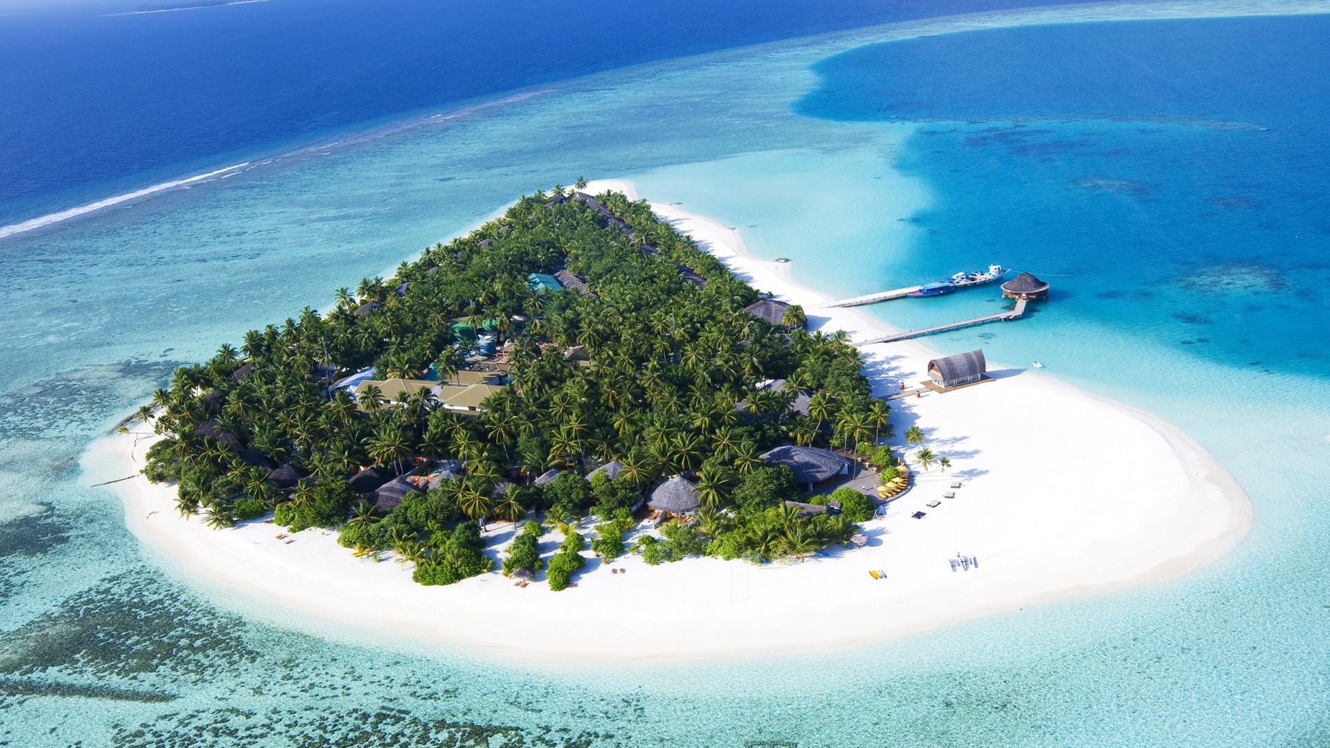 Description: An island with a dock and a house on it in the middle of the ocean with a boat in the water.