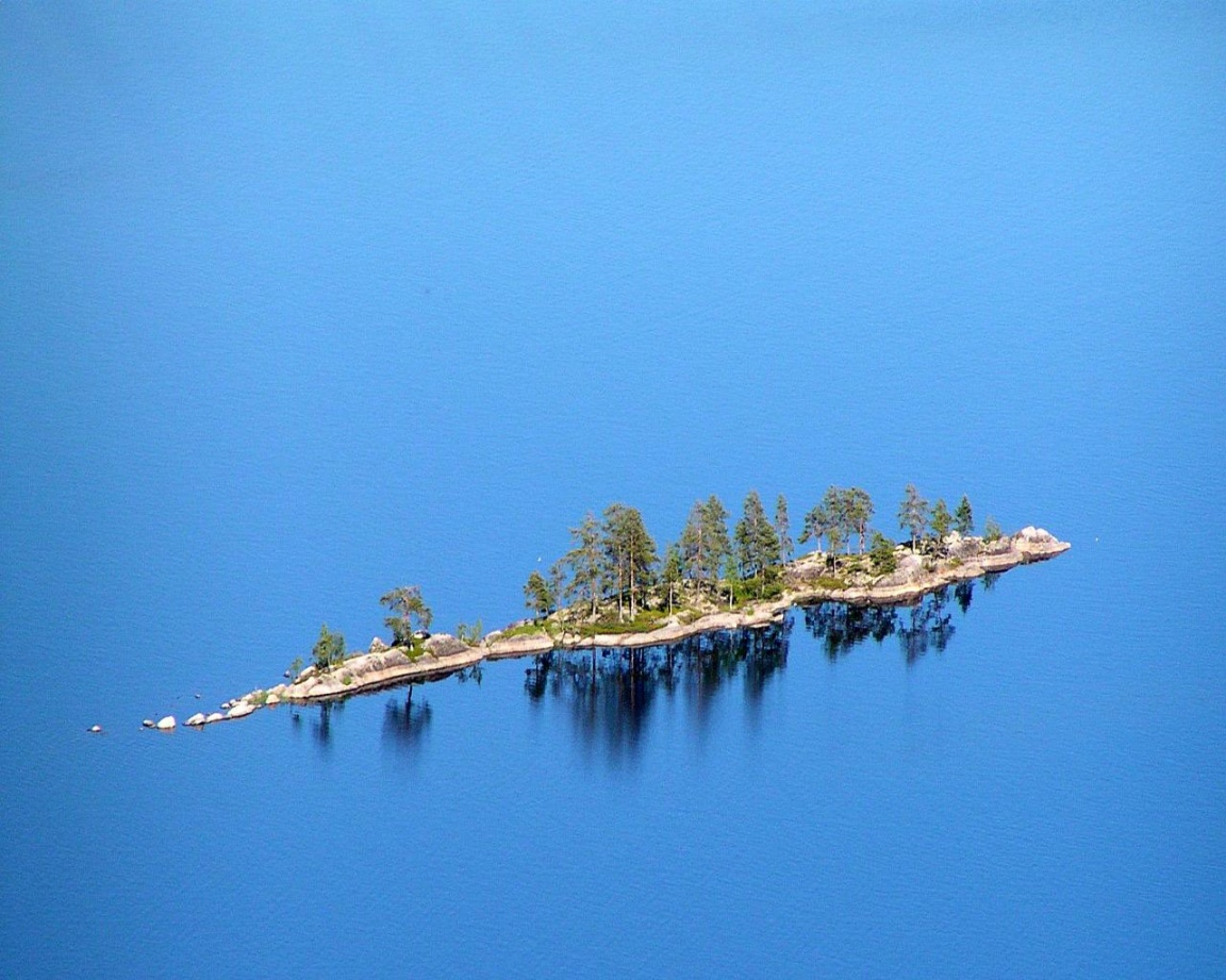 Description: An island in the middle of a lake with trees on it's sides and a few boats on the water.