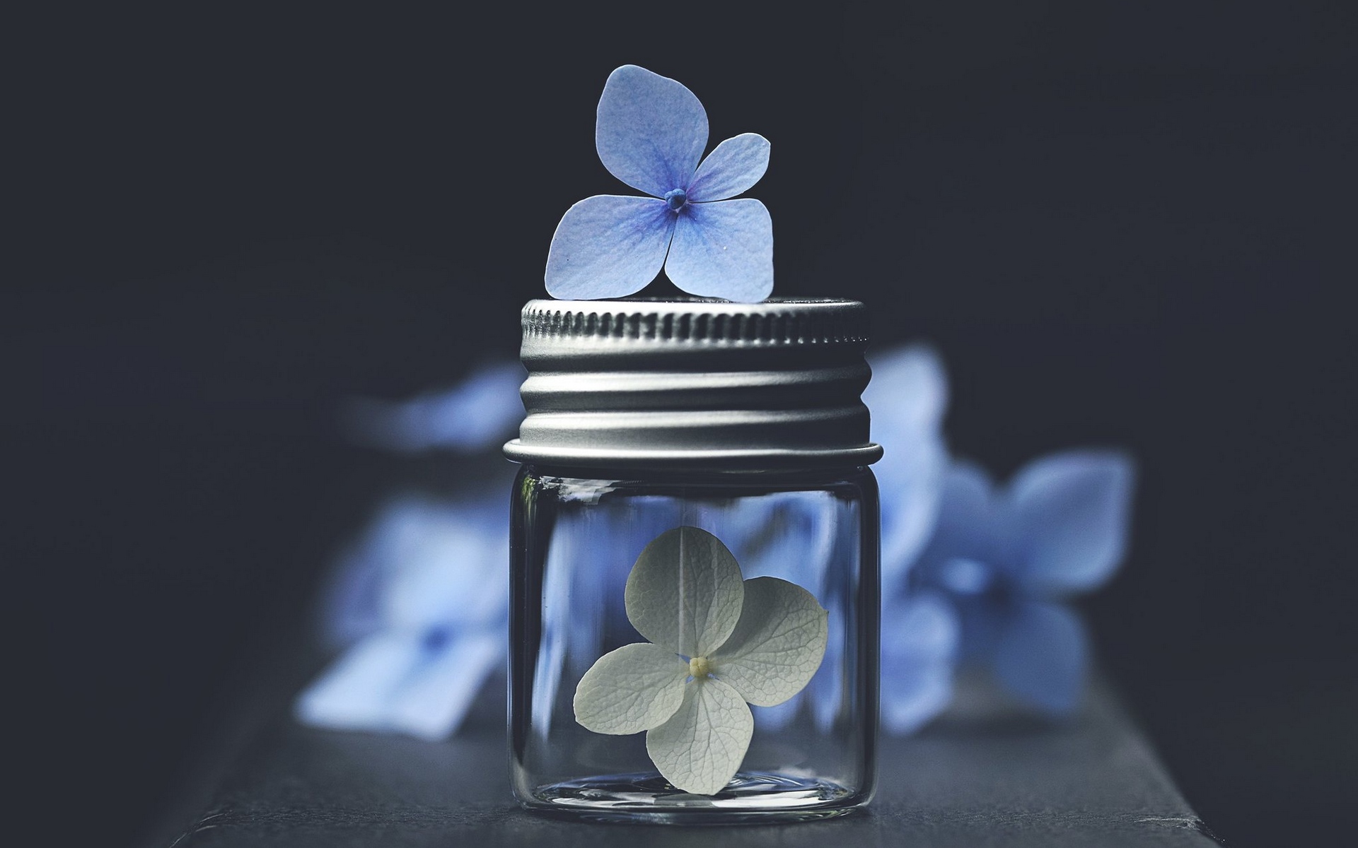 Description: A jar with a flower inside of it on a table next to a blue flower on a black surface.