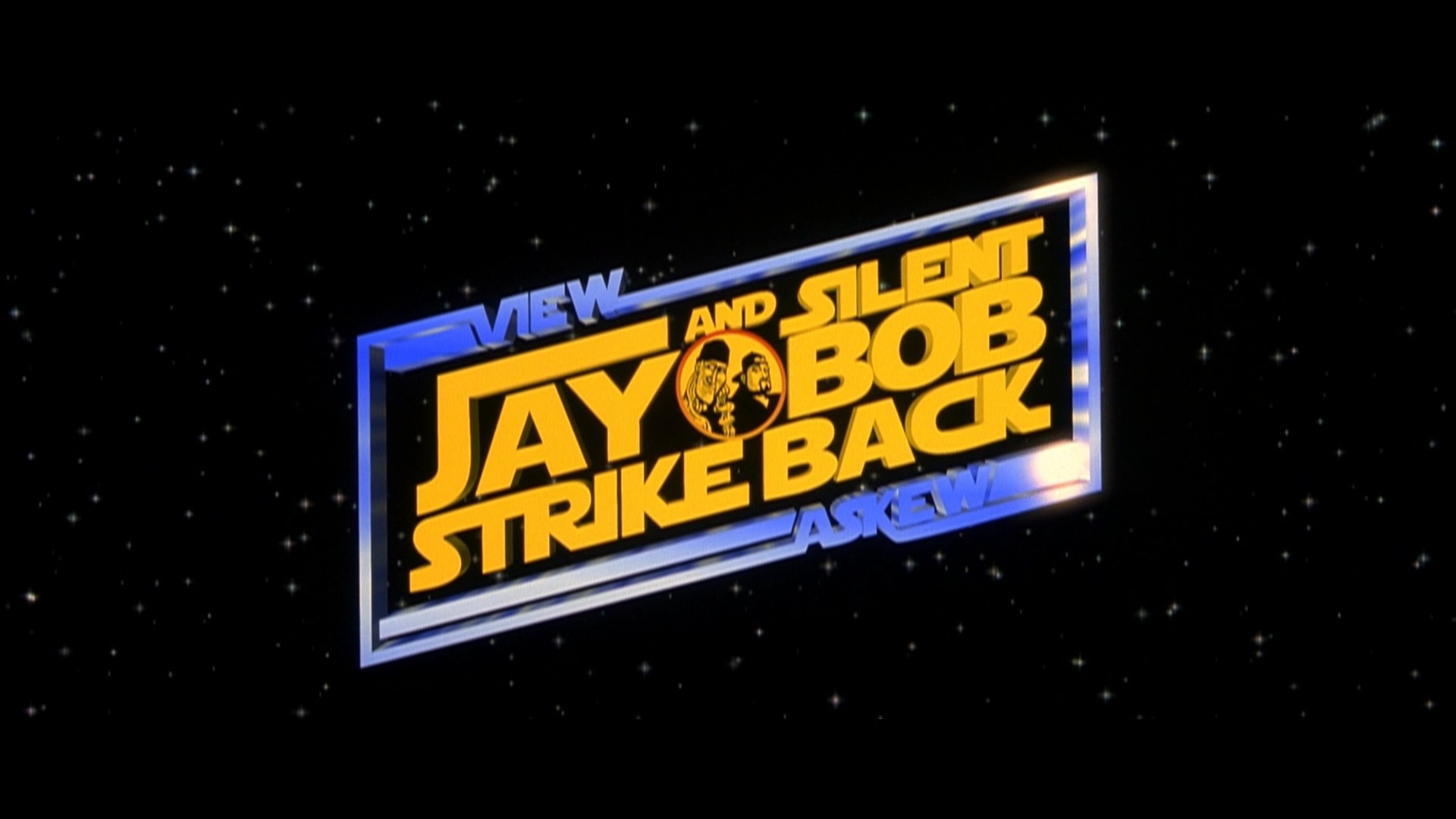 Description: A sign that says jay bob strike back on a dark background with stars in the sky behind it and a star wars logo.