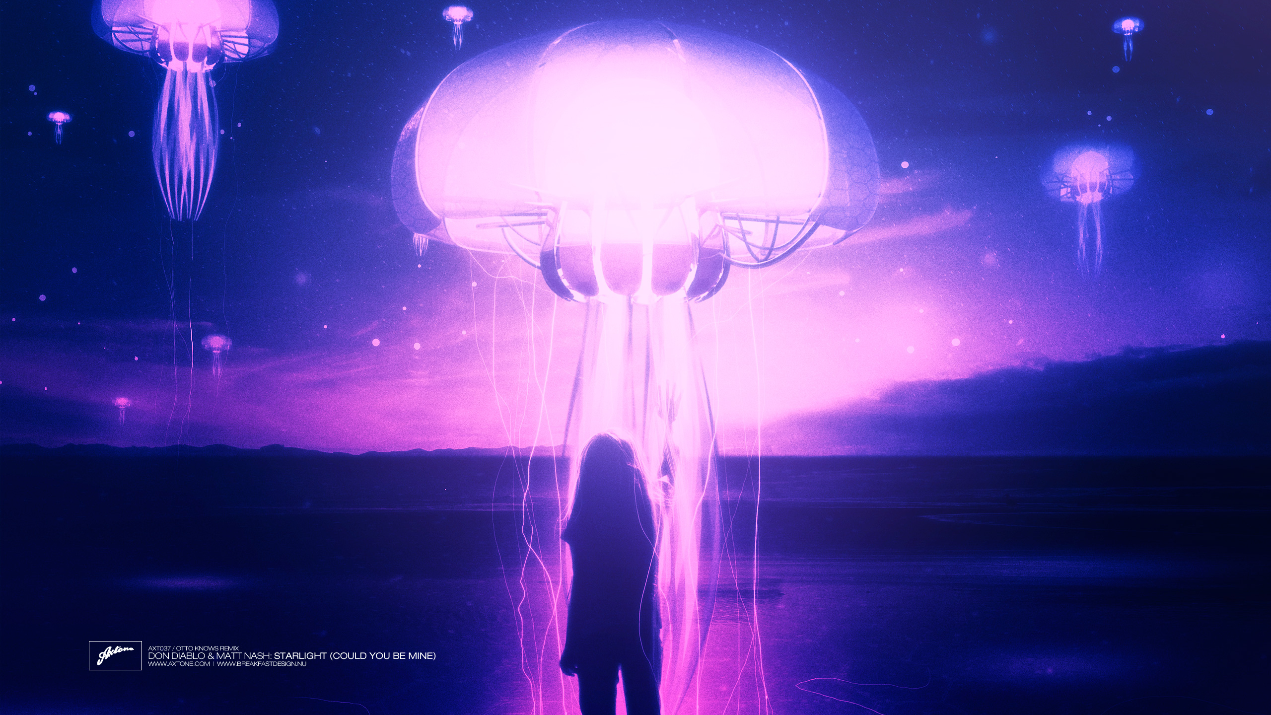 Description: A person standing in front of a jellyfish in the ocean with jellyfish floating around them and a purple sky.