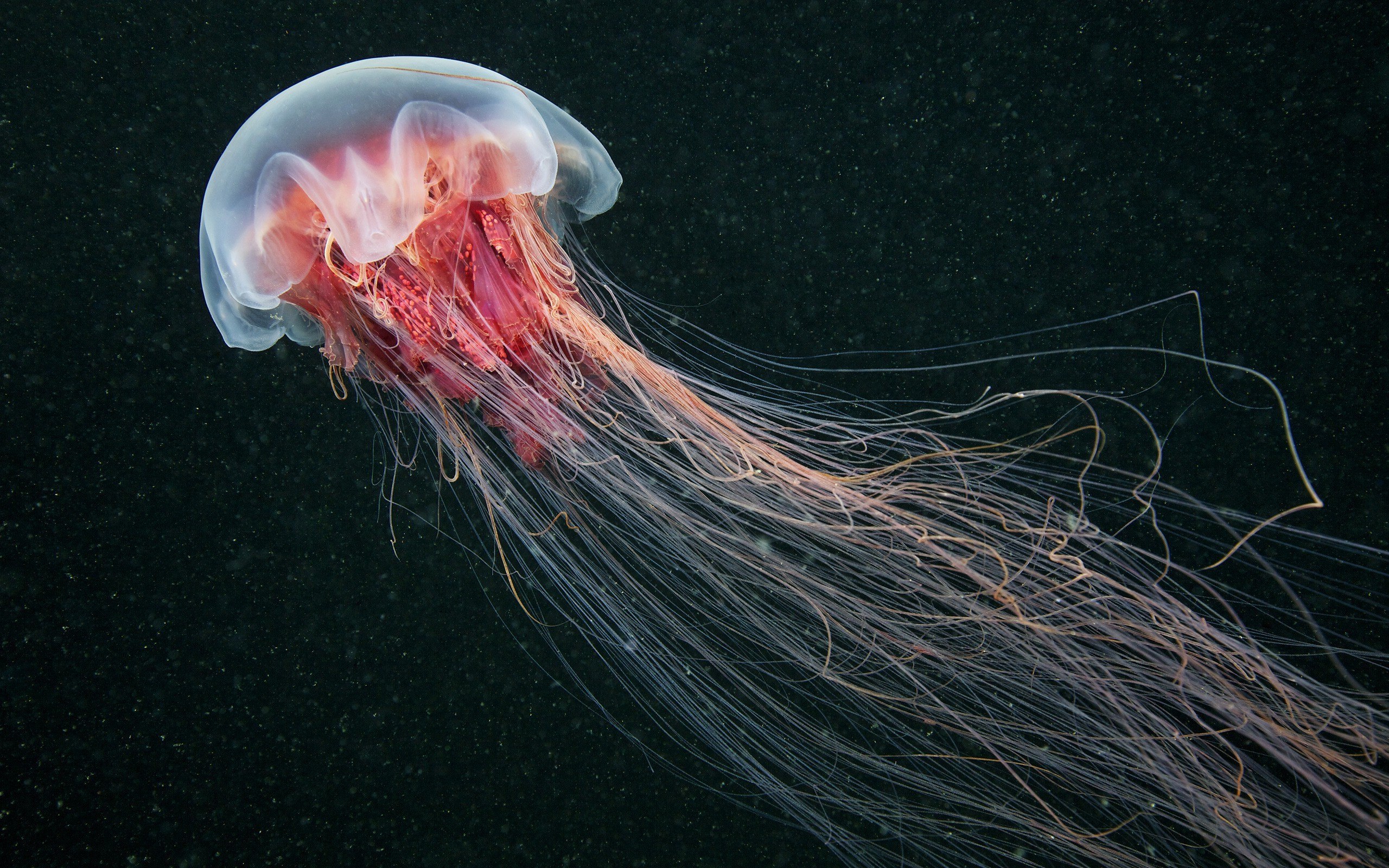 Description: A jellyfish with a red head and white tentacles floating in the water with black background and water bubbles.